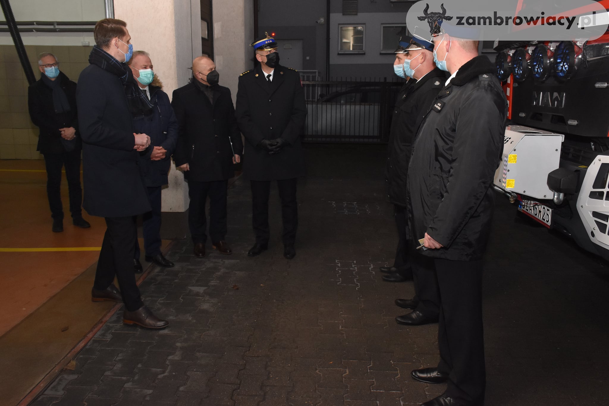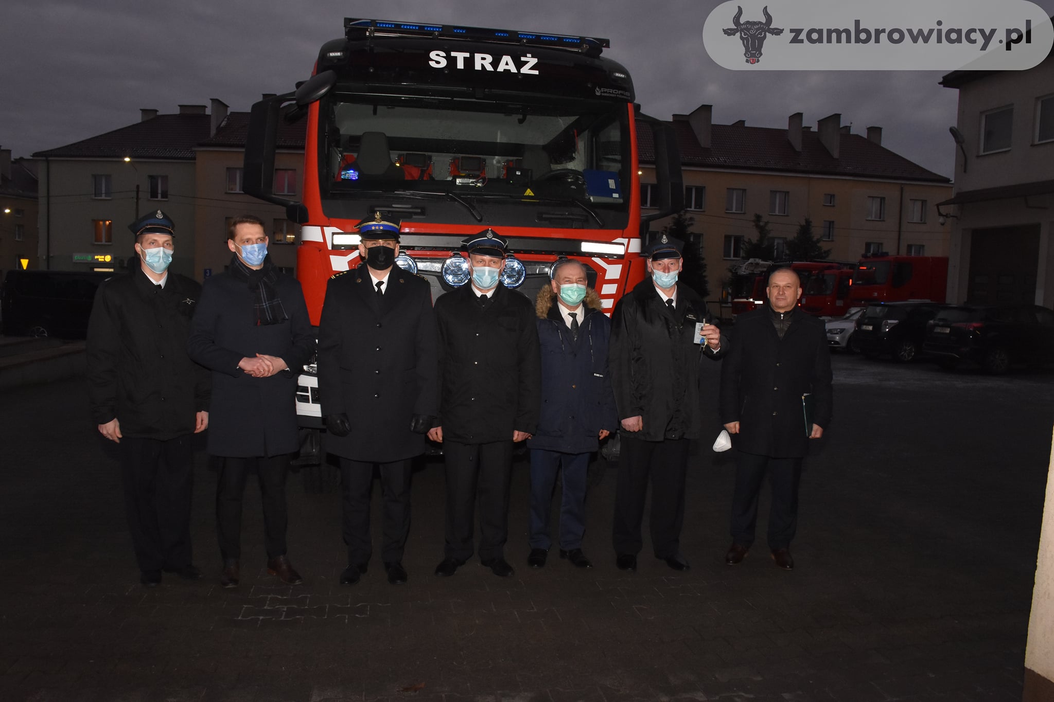 Klucze i dokumenty wozu na ręce strażaków z jednostki OSP w Starym Laskowcu przekazali: Wójt Gminy Zambrów Pan Jarosław Kos, Podlaski Komendant Wojewódzki Państwowej Straży Pożarnej st. bryg. Sebastian Zdanowicz, Wicemarszałek Województwa Podlaskiego Pan Marek Olbryś i Prezes Zarządu Wojewódzkiego Funduszu Ochrony Środowiska i Gospodarki Wodnej w Białymstoku Pan Maciej Borzyszkowski.
