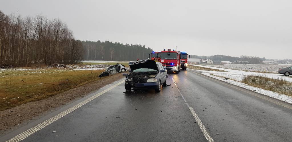 W chwili dojazdu na miejsce zdarzenia zastępów SP zastano rozbity samochód osobowy marki Suzuki Swift znajdujący się w przydrożnym rowie, wewnątrz pojazdu znajdował się przytomny mężczyzna, który nie mógł wydostać się z pojazdu o własnych siłach, uskarżał się na ból klatki piersiowej oraz nóg. Na prawym pasie drogi w kierunku Łomży stał samochód osobowy mercedes z rozbitym przodem, widoczny mały wyciek płynów eksploatacyjnych, samochodem podróżował tylko kierowca, był bez obrażeń, opuścił pojazd przed przybyciem służb. Również na prawym pasie drogi w odległości ok. 150 metrów od samochodów osobowych stał samochód ciężarowy - cysterna przewożący wodorotlenek sodowy oraz kwas azotowy - płaszcz cysterny nie uległ uszkodzeniu, brak zagrożenia (kierowca nie odniósł żadnych obrażeń). Uszkodzony został lewy bok ciągnika siodłowego oraz obtarty bok naczepy na wysokości opon. Na miejscu obecni: ZRM oraz Patrol Policji.