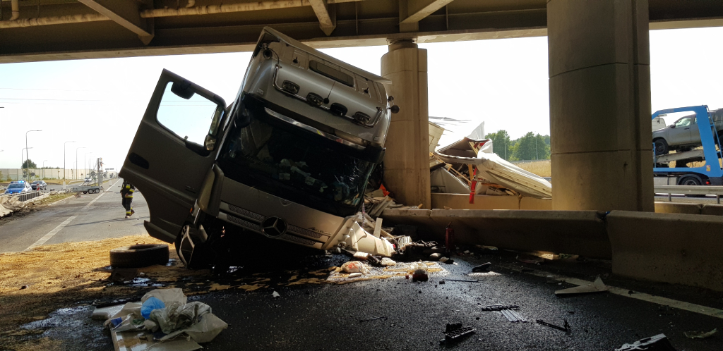 W chwili przyjazdu zastępów SP na miejsce zdarzenia zastano ciągnik siodłowy Mercedes Benz Actros z naczepą leżący na lewym boku na barierach energochłonnych pomiędzy dwoma pasami ruchu, opierający się naczepą o filar wiaduktu. Ładunek przewożony na naczepie stanowiły napędy do bram garażowych znajdujące się na drewnianych paletach. Widoczne było rozlewisko oleju napędowego o powierzchni ok. 120 m2 (paliwo nadal wypływało z uszkodzonego zaworu zbiornika). Kierujący ciężarówką 47-letni mężczyzna (obywatel Łotwy) samodzielnie opuścił pojazd i w bezpiecznym miejscu oczekiwał na przybycie służb. Po przybyciu ZRM został zbadany i pozostawiony na miejscu zdarzenia (brak obrażeń i konieczności hospitalizacji). Droga w miejscu kolizji została całkowicie zamknięta dla ruchu w obydwu kierunkach (przybyłe na miejsce zdarzenia patrole Policji wyznaczyły objazdy drogami serwisowymi). Działania straży pożarnej polegały na zabezpieczeniu miejsca zdarzenia, uszczelnieniu uszkodzonego zaworu zbiornika paliwa, ograniczeniu i zebraniu rozlewiska przy pomocy sorbentów naturalnych (piasku i trocin). Następnie zneutralizowano pozostały na jezdni film olejowy środkiem Sintan i zmyto jezdnię dwoma prądami wody. Dalsze działania polegały na pomocy służbom drogowym w usunięciu wraku naczepy, ciągnika siodłowego oraz uprzątnięciu przewożonego ładunku.
