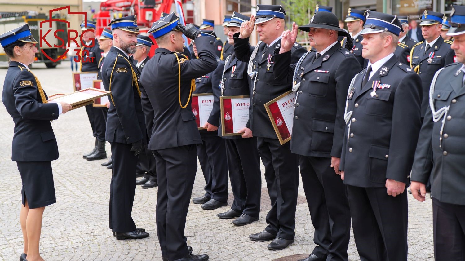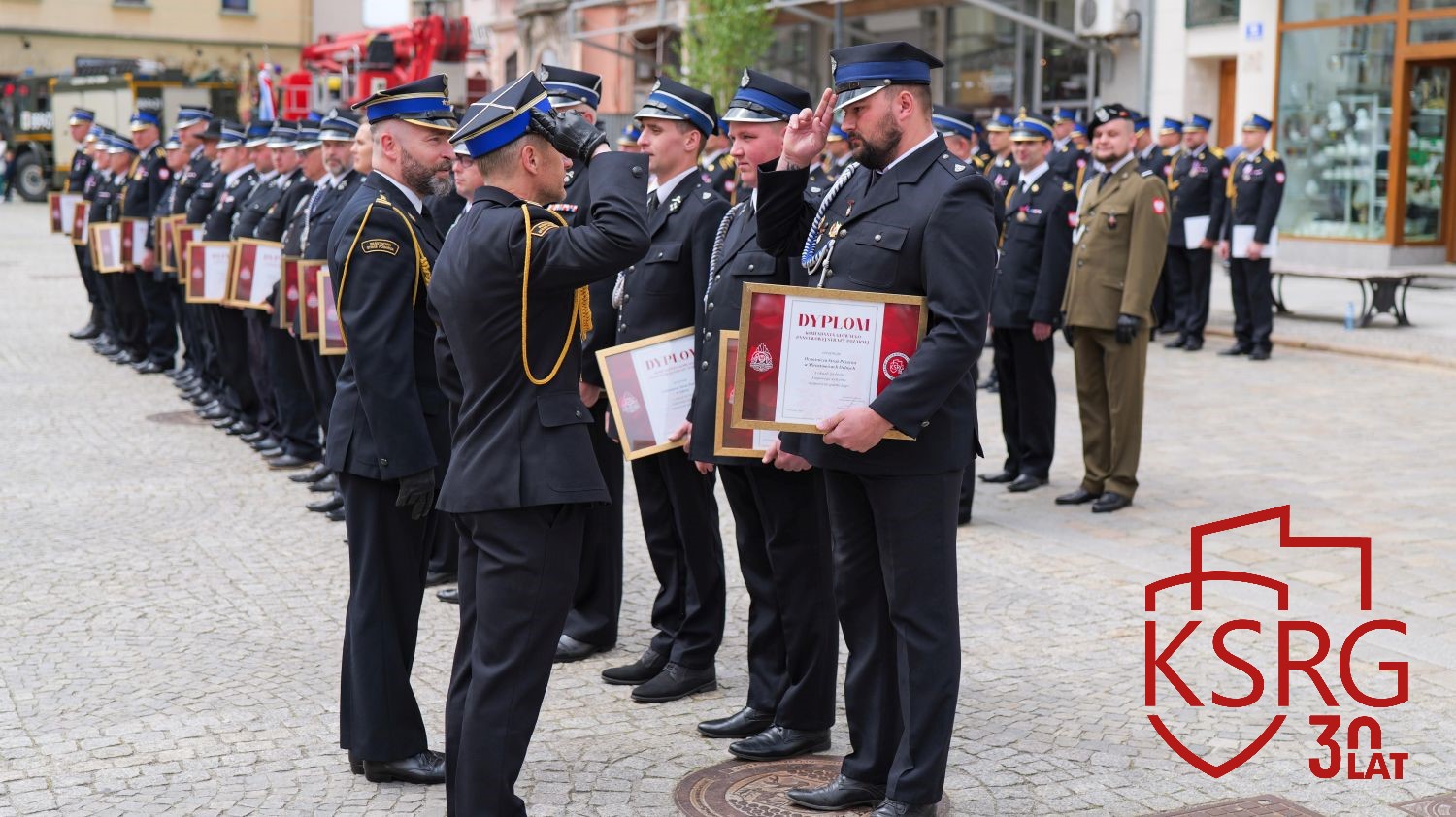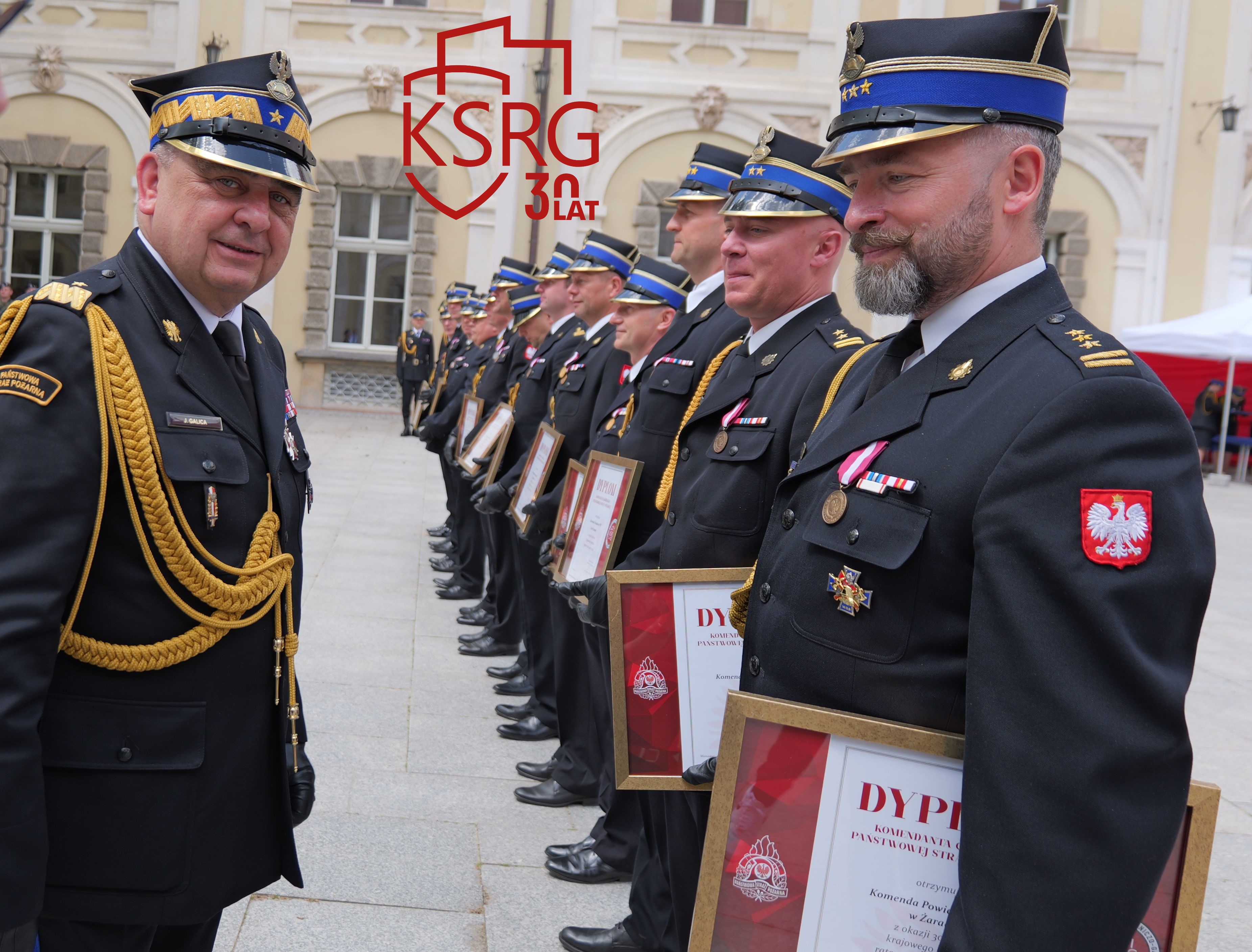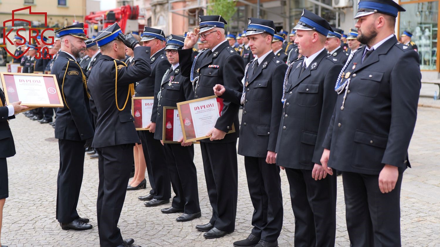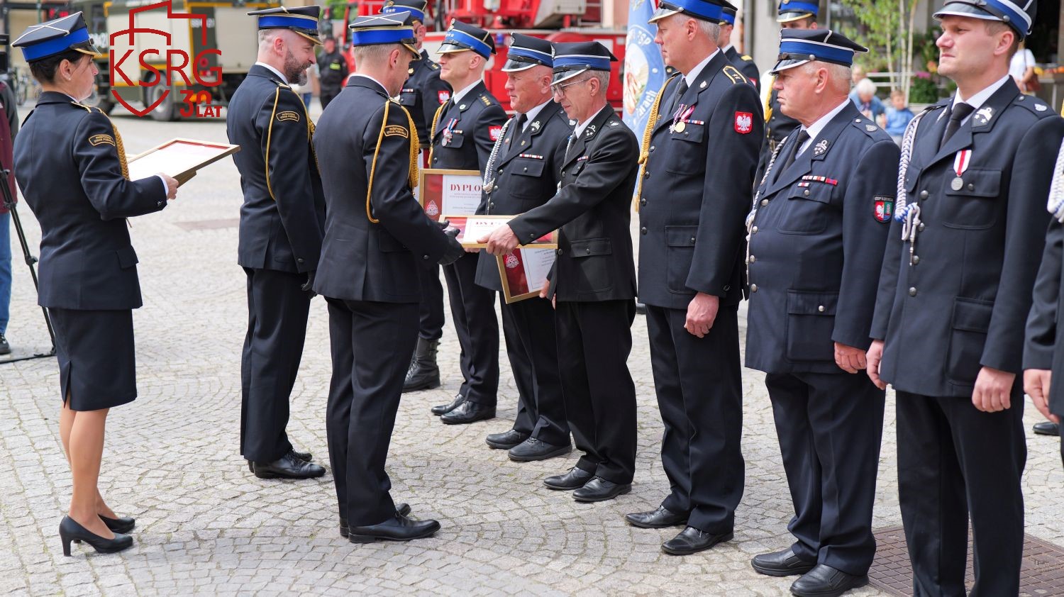 Podczas Powiatowych Obchodów Dnia Strażaka w Żarach dowódcy, prezesi i naczelnicy jednostek KSRG otrzymali dyplomy Komendanta Głównego Państwowej Straży Pożarnej z okazji jubileuszu 30 lecia KSRG.