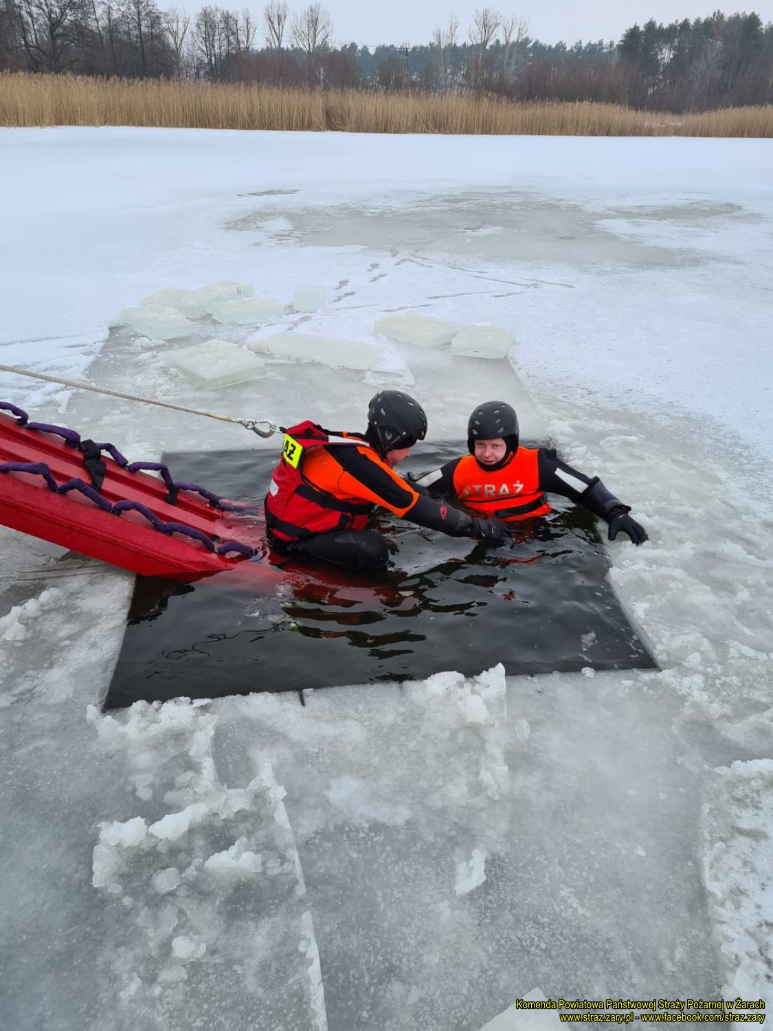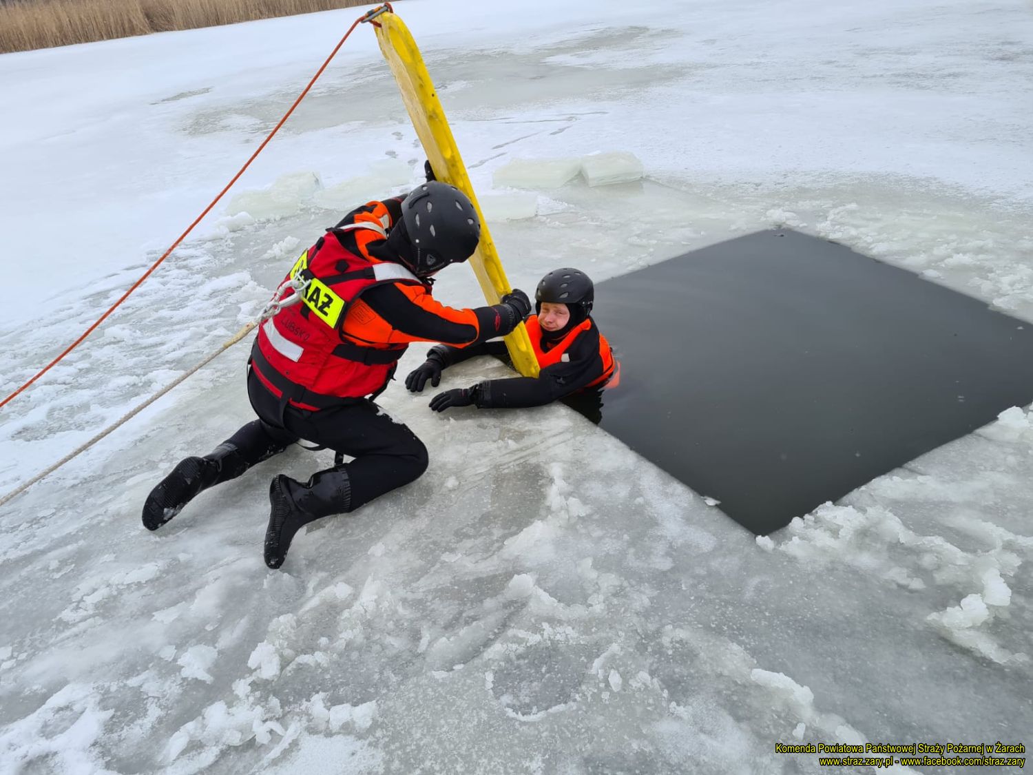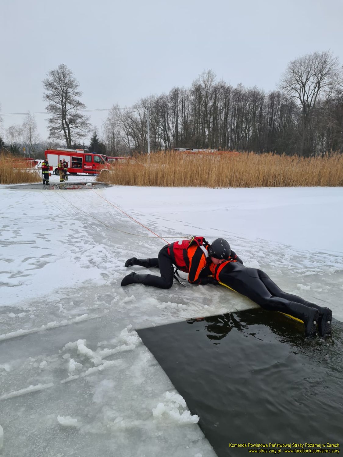 Ćwiczenia żarskich strażaków z zakresu ratownictwa na lodzie