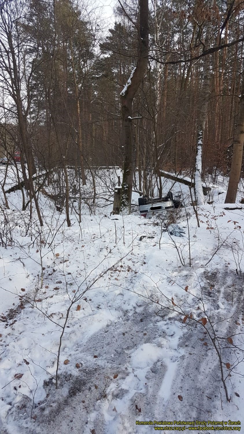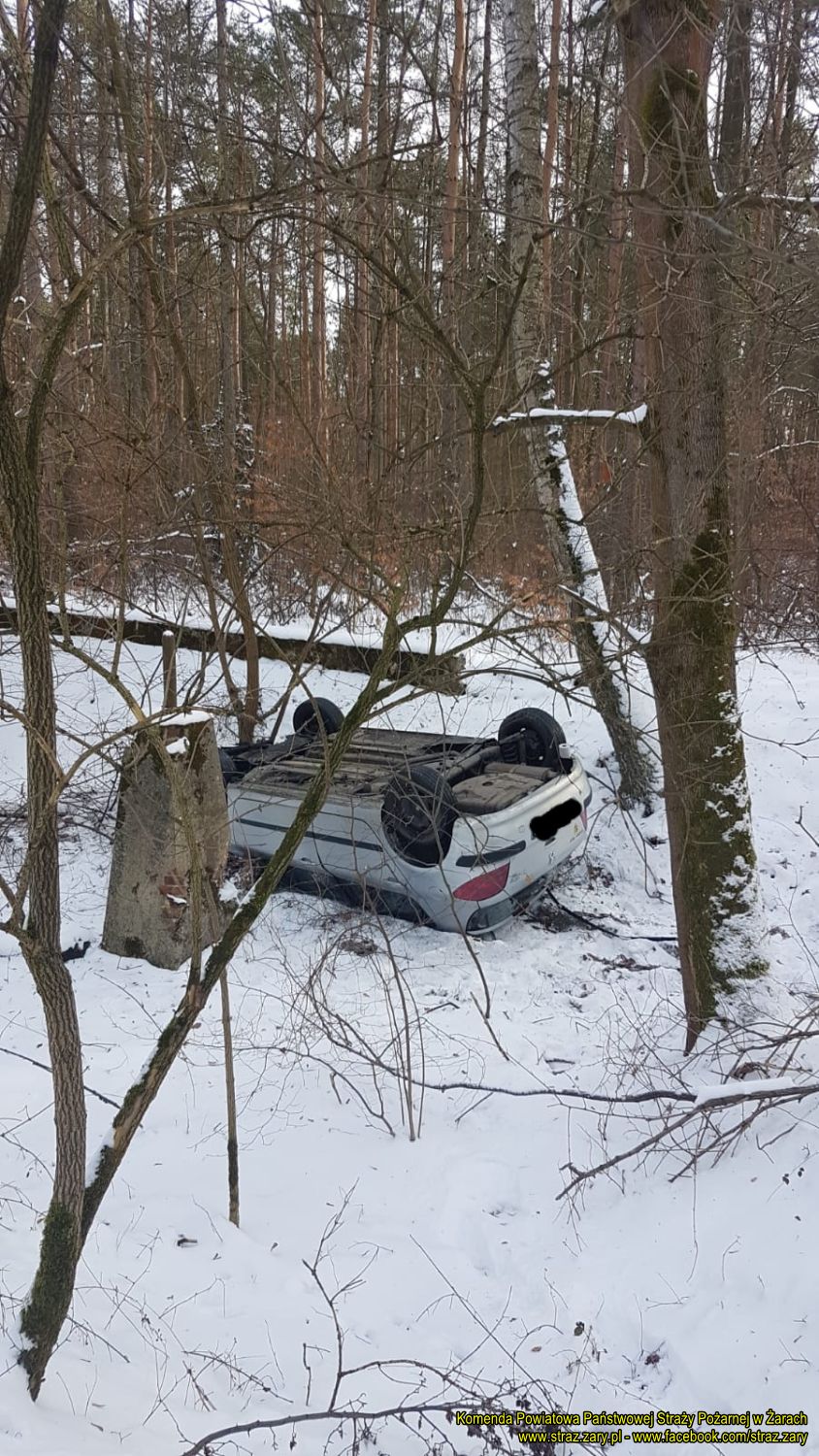 W dniu 15 lutego 2021 r. o godzinie 13:41 do Stanowiska Kierowania Komendanta Powiatowego w Żarach wpłynęło zgłoszenie o dachowaniu samochodu osobowego marki Peugoet 307 przy drodze krajowej nr 12. Natychmiast zadysponowano do zdarzenia trzy zastępy z Jednostki Ratowniczo-Gaśniczej w Żarach. Działania zastępów polegały na zabezpieczeniu miejsca zdarzenia, wstrzymanie ruchu komunikacyjnego na jednym psie jezdni, odłączeniu akumulatora. Osoby biorące udział w kolizji odmówiły przyjęcia przedmedycznej pomocy. Przyczyną kolizji było niedostosowanie prędkości pojazdu do panujących warunków atmosferycznych.