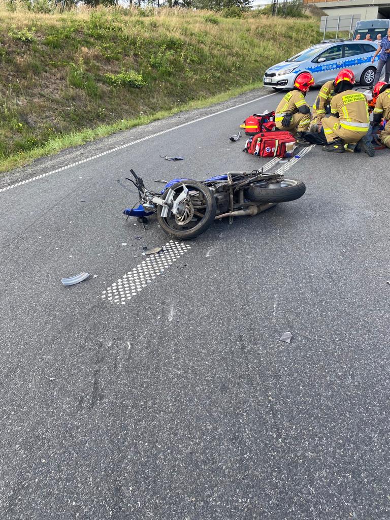 Z chwilą przybycia pierwszego zastępu na miejsce zgłoszenia Kierujący Działaniami Ratowniczymi potwierdził udział w wypadku motocykla i samochodu osobowego marki Toyota Avensis. W wyniku zderzenia czołowo-bocznego pojazdów, motocyklista został poszkodowany.