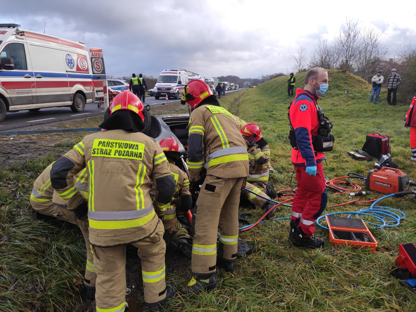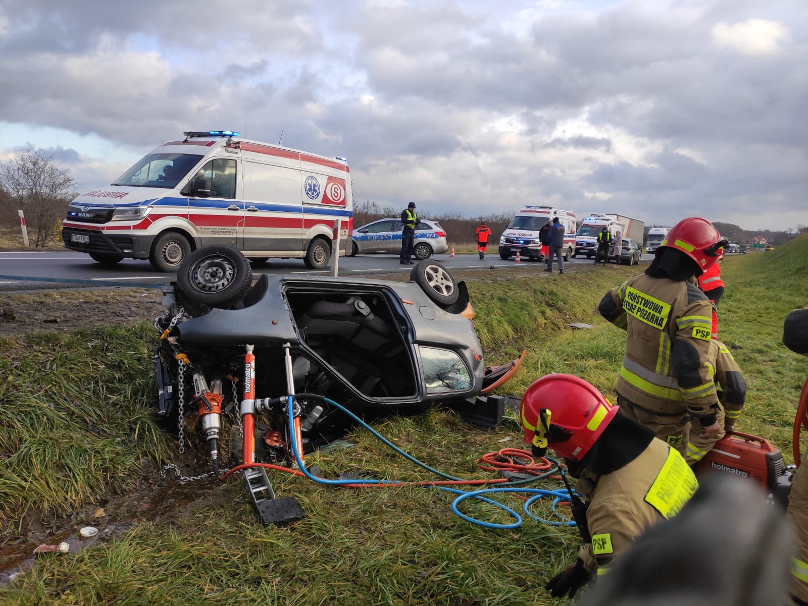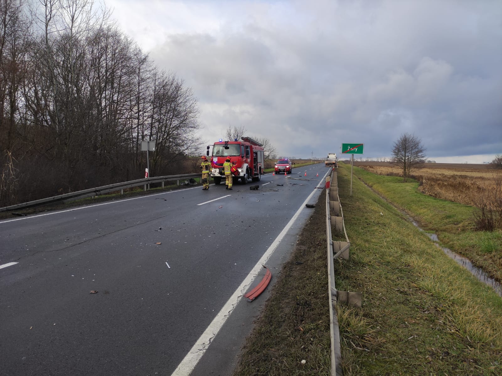 Po przyjeździe pierwszego zastępu na miejsca zdarzenia zastano samochód osobowy marki Fiat Seicento po zderzeniu z naczepą samochodu ciężarowego marki Man. Samochód w wyniku zderzenia dachował do rowu. W pojeździe została uwięziona jedna osoba.