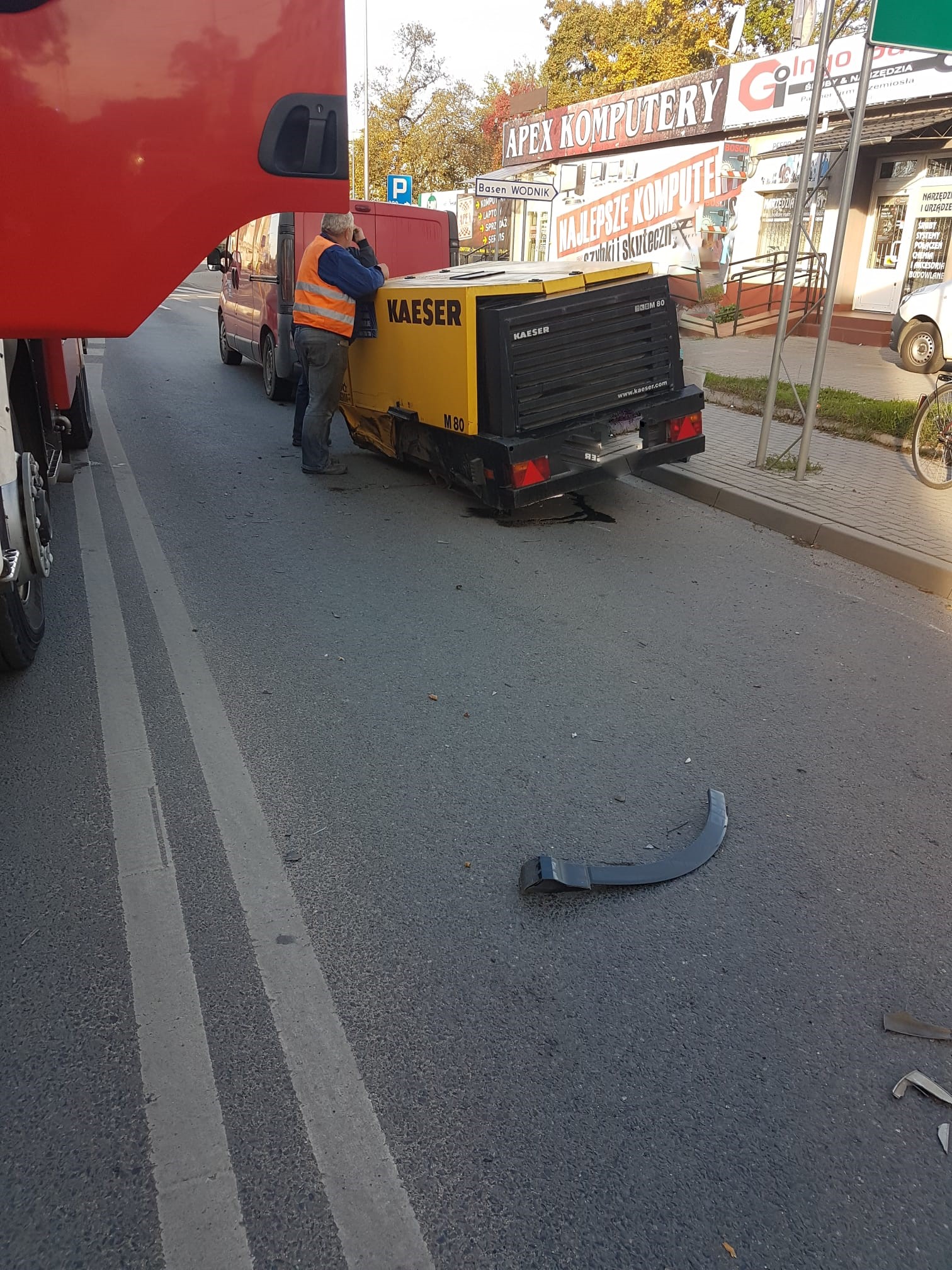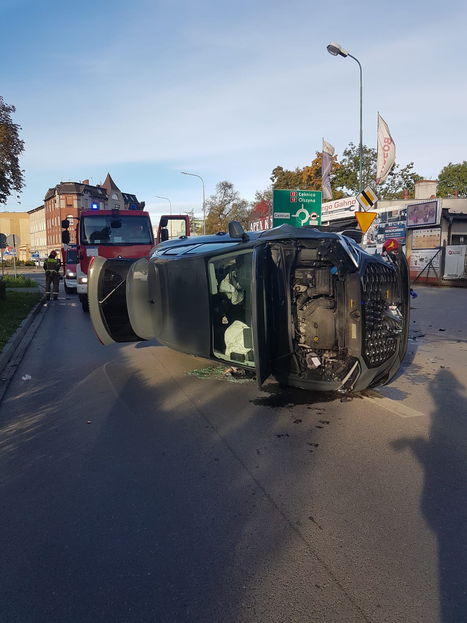 Z chwilą przyjazdu na miejsce zdarzenia pierwszego zastępu straży pożarnej zastano leżący na ulicy na prawym boku samochód osobowy marki AUDI Q3 oraz samochód bus marki Opel Vivaro z przyczepką (kompresorem).