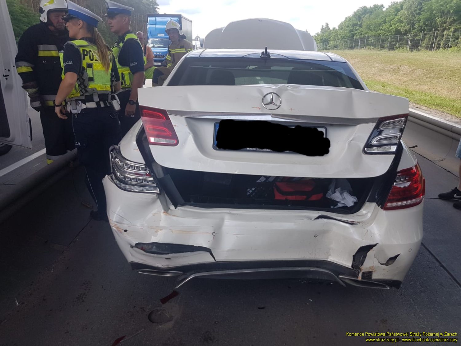 W poniedziałek 5 lipca 2021r. o godzinie 15:52 Stanowisko Kierowania Komendanta Powiatowego PSP w Żarach otrzymało zgłoszenie o zdarzeniu drogowym na 10 km Drogi Krajowej nr 18 w kierunku przejścia granicznego z Niemcami. Dyżurny Stanowiska Kierowania natychmiast do zdarzenia zadysponował dwa zastępy z JRG Żary oraz dwa zastępy z OSP Trzebiel. Z chwilą przybycia zastępów straży pożarnej na miejsce zdarzenia Kierujący Działaniami Ratowniczymi przekazał informację o kolizji drogowej, która powstała na skutek najechania samochodu ciężarowego marki Volvo na tył samochodu osobowego marki Mercedes. Na miejscu również obecny był patrol Policji oraz Zespół Ratownictwa Medycznego, który udzielał pomocy osobie poszkodowanej (kierowca samochodu osobowego). Na czas działań służb ratowniczych cała Droga Krajowa Nr 18 została zamknięta.
