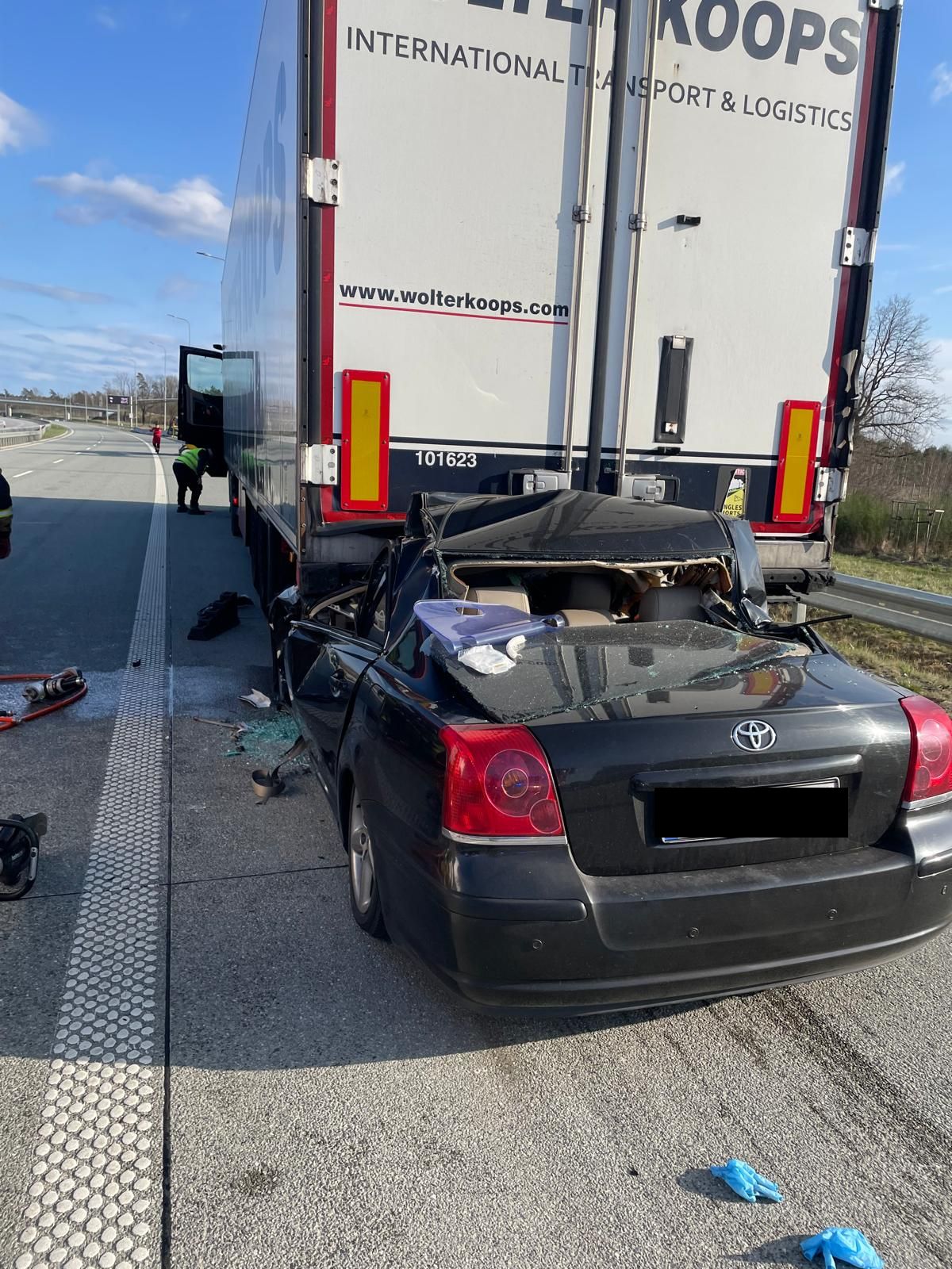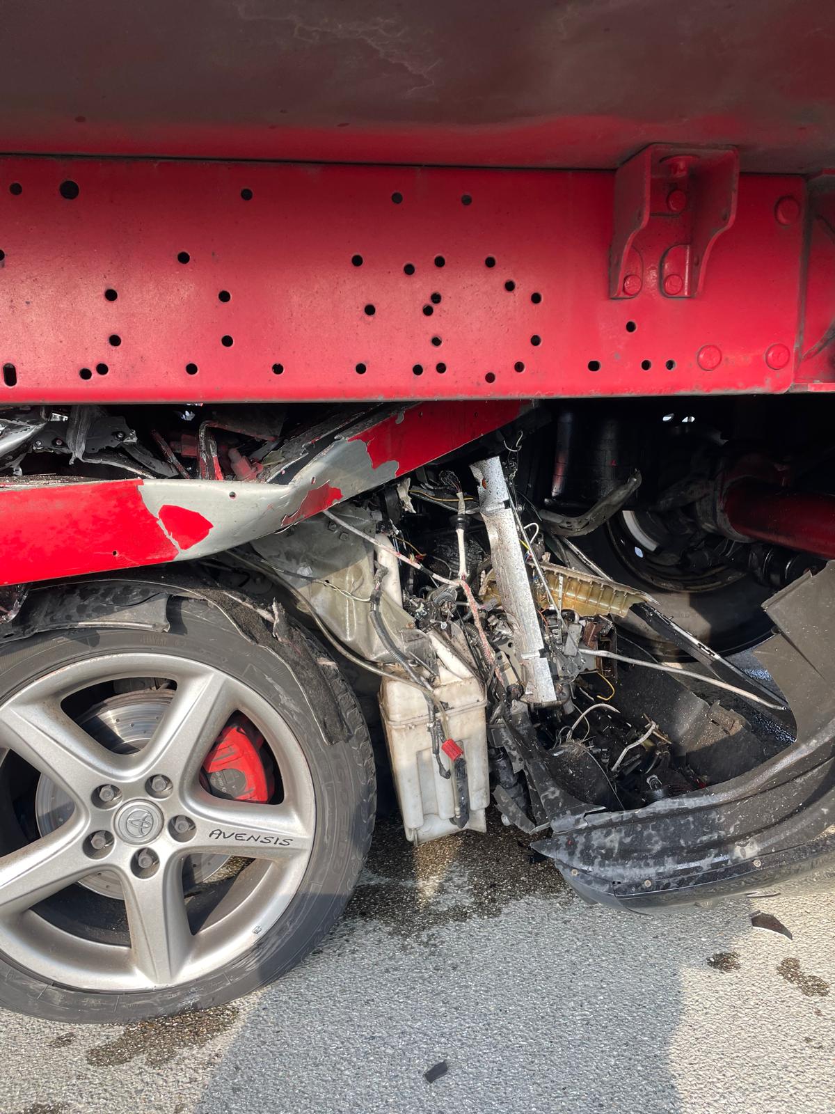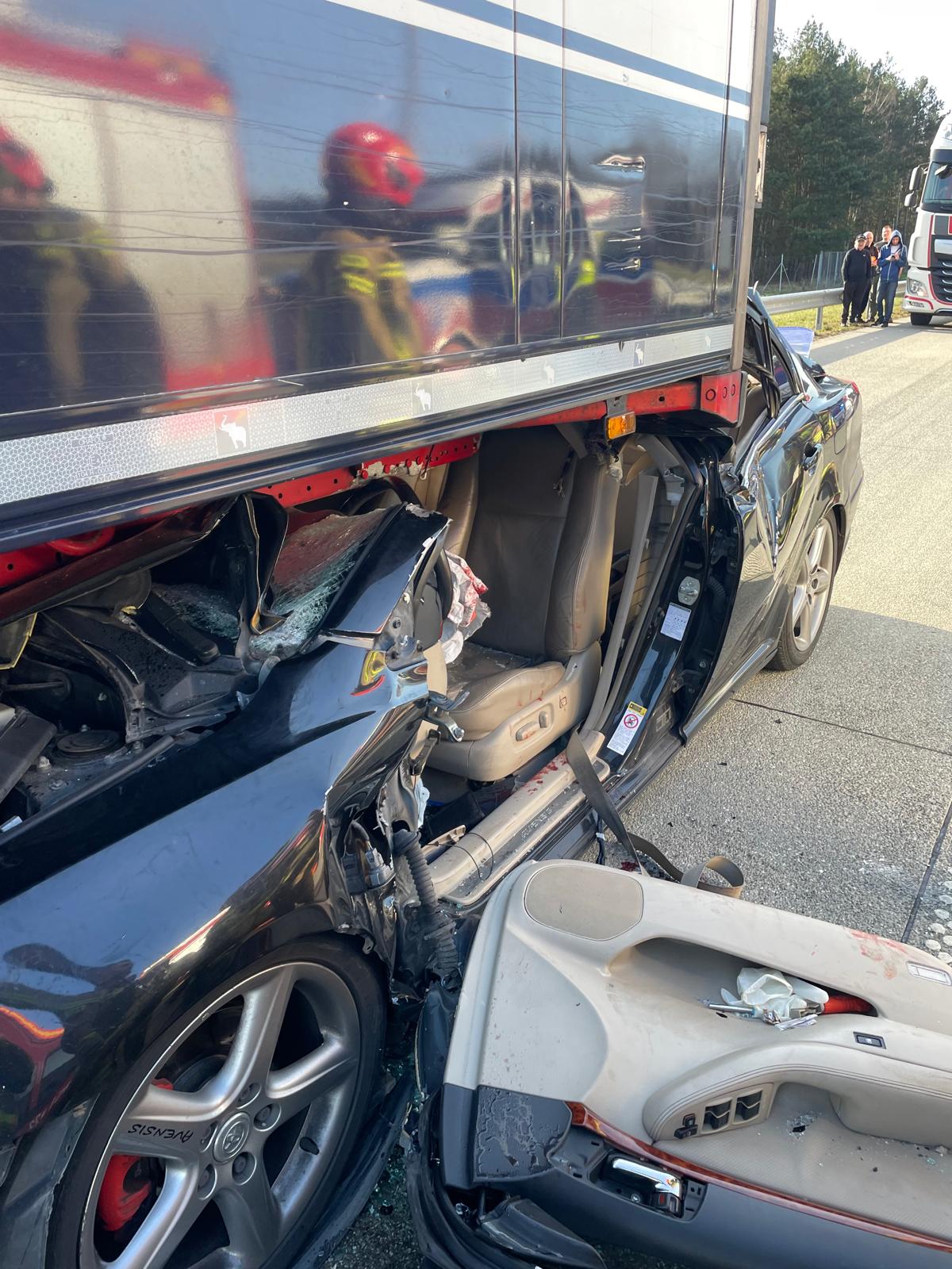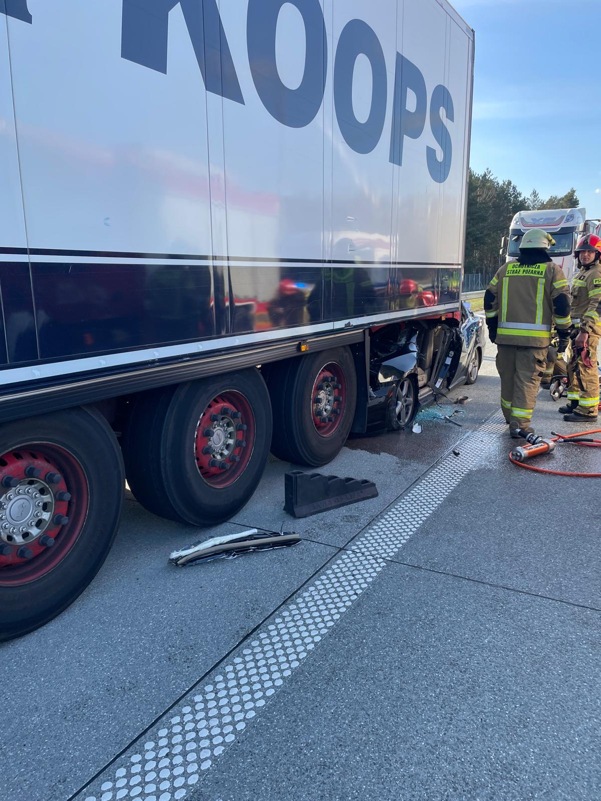 Na miejscu strażacy zastali samochód osobowy po zderzeniu z samochodem ciężarowym. Kierujący Toyotą wjechał z dużym impetem w tył naczepy pojazdu ciężarowego. W wyniku zderzenie jedna osoba podróżująca osobówką została uwięziona w pojeździe. Działania zastępów polegały na zabezpieczeniu miejsca zdarzenia, wykonaniu dostępu do poszkodowanego, ewakuacji poszkodowanego z wraku pojazdu oraz przekazaniu jednostkom Państwowego Ratownictwa Medycznego.