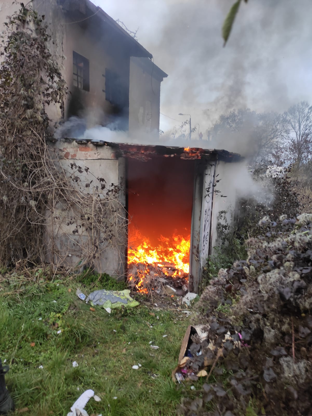 Po przyjeździe pierwszego zastępu na miejsca zdarzenia zastano pożar budynku gospodarczego, paliły się śmieci i dach drewniany. Dodatkowo zagrożony był w bezpośrednim sąsiedztwie kolejny budynek gospodarczy.