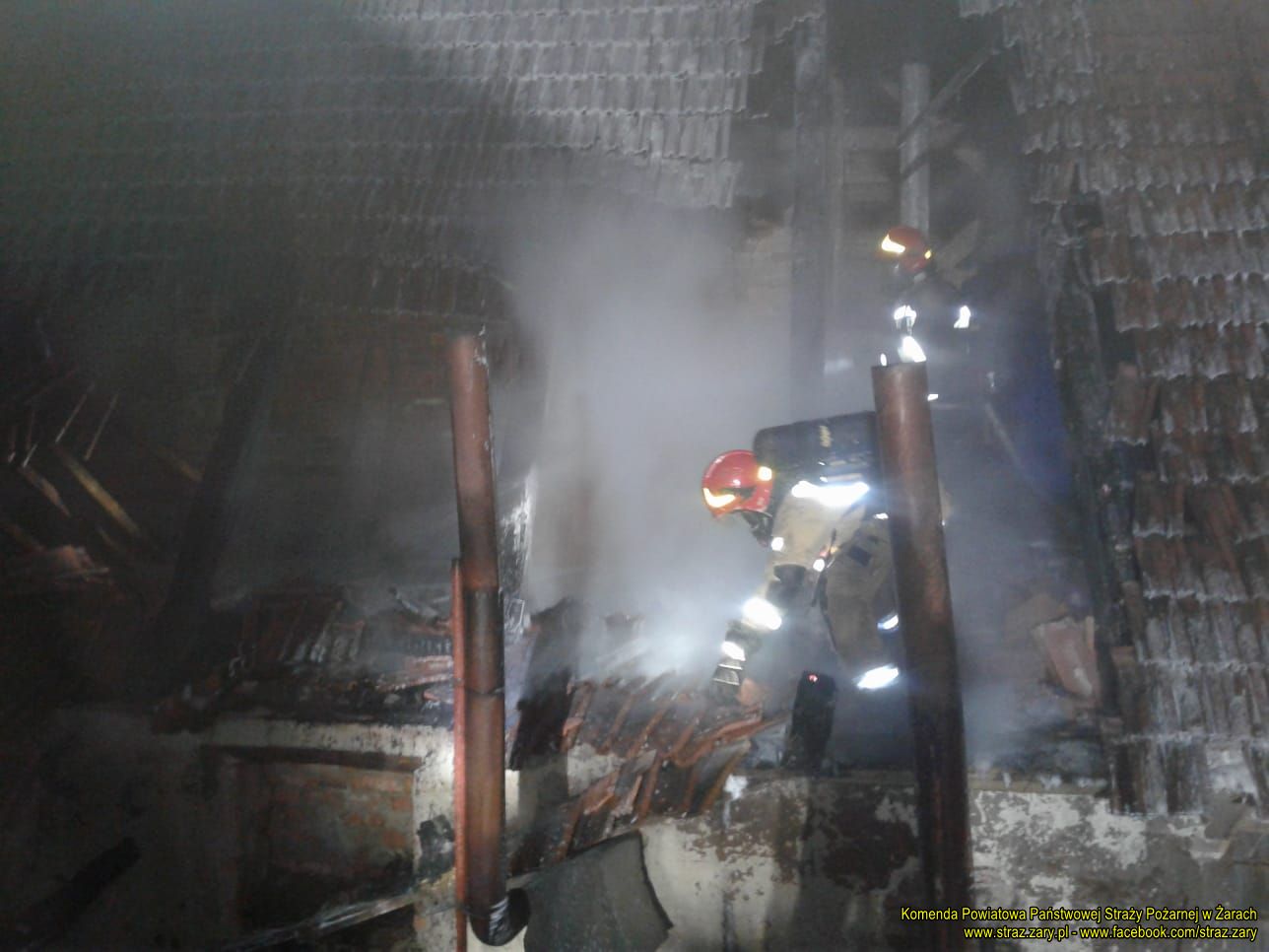W dniu 02.04.2021 o godzinie 23:00 dyżurny Stanowiska Kierowania Komendanta Powiatowego PSP w Żarach przyjął zgłoszenie o pożarze budynku gospodarczego w miejscowości Jasionna. Natychmiast zadysponował do zdarzenia zastępy z JRG Lubsko i OSP Jasień. Z chwilą przyjazdu pierwszego zastępu straży pożarnej pożarem objęty był dach budynku gospodarczego na powierzchni 15 m2. Działania straży pożarnej polegały na zabezpieczeniu miejsca zdarzenia i ugaszeniu palącego się dachu oraz poddasza budynku gospodarczego. Akcja gaśnicza trwała około 3 godziny.