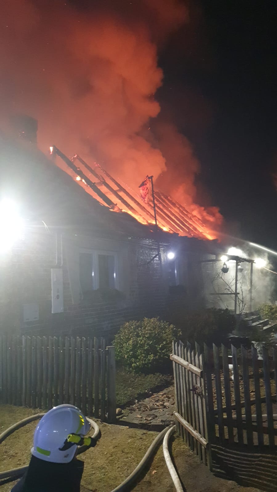 Po przybyciu pierwszych zastępów na miejsce zdarzenia zastano w pełni rozwinięty pożar, ogień obejmował całą powierzchnię dachu oraz pomieszczenia na parterze. Konstrukcja dachu była w znacznym stopniu nadpalona, groziła zawaleniem. W wyniku rozpoznania ustalono, że w części objętej pożarem może znajdować się osoba poszkodowana (nie potwierdzono obecności podczas działań).