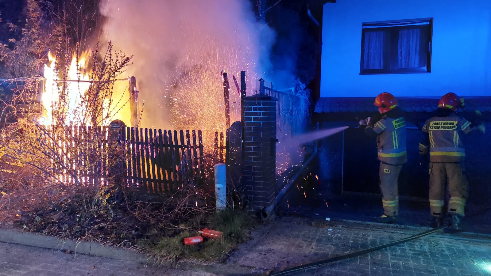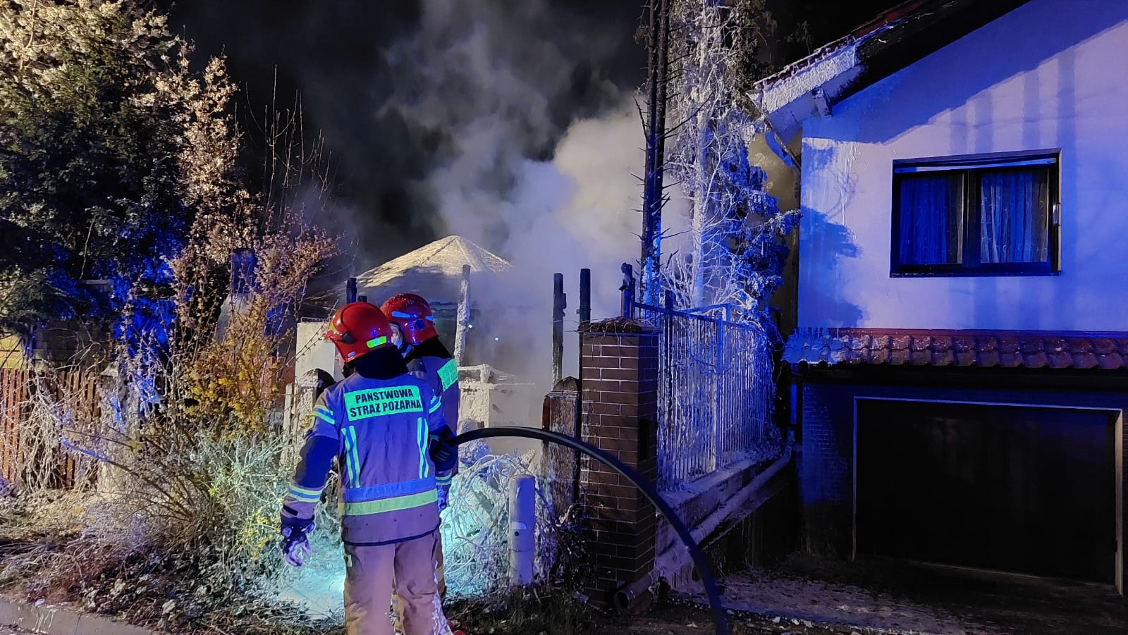 Po przybyciu pierwszego zastępu na miejsce zdarzenia stwierdzono, że pożarem objęta jest cała wiata ogrodowa oraz przyległe drzewa.