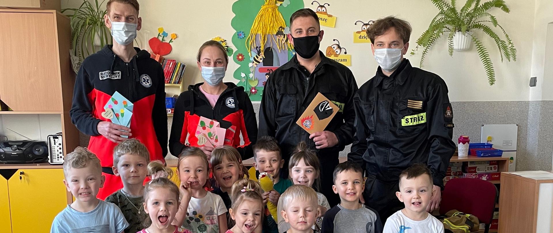 Podczas wizyty, dzieci poznały na czym polega praca Strażaka i Ratownika Medycznego. Każdy z uczestników spotkania mógł przymierzyć ubranie w jakim strażacy pracują podczas akcji, nazwać jego poszczególne elementy oraz potrenować udzielanie pierwszej pomocy.