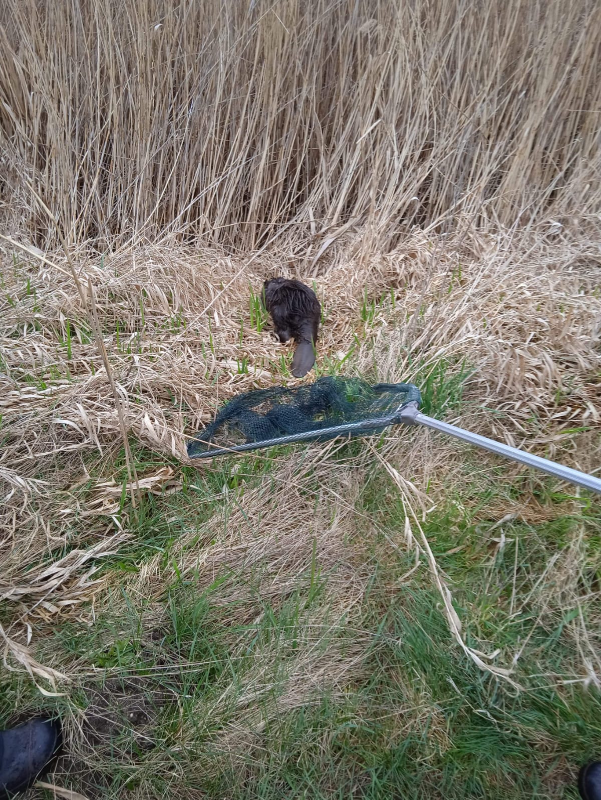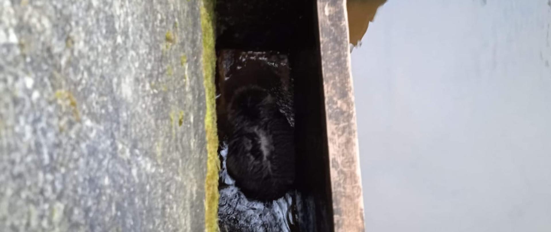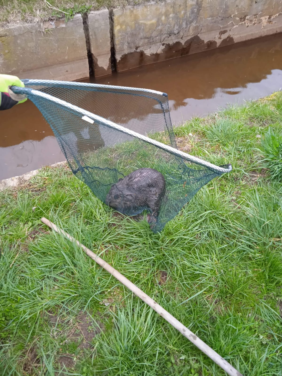 Uwięziony bóbr w studzience przy grobli stawu w miejscowości Nabłoto
