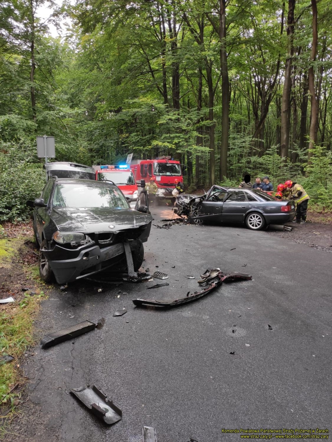 W dniu 23 sierpnia 2021 r. o godzinie 08:17 dyżurny Stanowiska Kierowania Komendanta Powiatowego w Żarach przyjął zgłoszenie o wypadku drogowym przed miejscowością Łaz, w którym brały udział dwa samochody osobowe marki Mercedes i Audi. Natychmiast zadysponował trzy zastępy strażaków z JRG Żary i jednostki OSP Mirostowice Dolne. Działania zastępów straży pożarnej polegały na zabezpieczeniu miejsca zdarzenia, udzieleniu pierwszej pomocy przedmedycznej osobie poszkodowanej oraz odłączeniu przewodów akumulatorów w pojazdach. Na miejscu obecny również był patrol Policji oraz Zespół Ratownictwa Medycznego (ZRM). Osoba poszkodowana po zaopatrzeniu ran została przewieziona na SOR w Żarach celem wykonania dalszej diagnostyki medycznej. Podczas działań ratowniczych droga była całkowicie zablokowana. Cała interwencja trwała sześć i pół godziny.