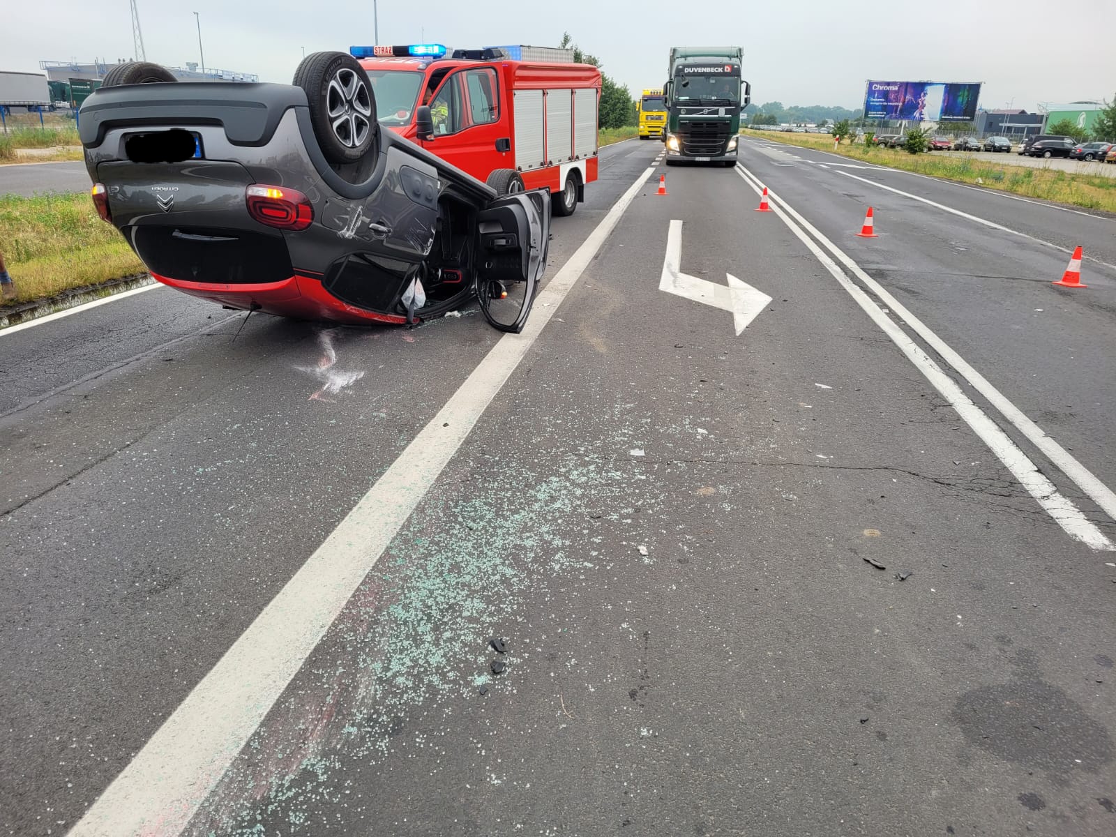 W dniu 20 czerwca 2022r. o godzinie 07.45 dyżurny Stanowiska Kierowania Komendanta Powiatowego Państwowej Straży Pożarnej w Żarach przyjął zgłoszenie o wypadku drogowym na obwodnicy Żary (droga krajowa nr 12). Natychmiast do zdarzenia zadysponował dwa zastępy z Jednostki Ratowniczo-Gaśniczej Żary. Z chwilą przybycia zastępów straży pożarnej na miejsce zdarzenia zastano samochód osobowy marki Citroen C3 na dachu wyniku zderzenia bocznego z samochodem marki Jeep. Osoby, które brały udział w zdarzeniu znajdowały się na zewnątrz pojazdów. Strażacy zabezpieczyli miejsce zdarzenia, udzielili Kwalifikowanej Pierwszej Pomocy oraz odłączyli przewody akumulatorów w samochodach. Na miejsce przybyli: Zespół Ratownictwa Medycznego, Policja oraz służba drogowa. Jedna osoba poszkodowana została przewieziona przez ZRM na Szpitalny Oddział Ratunkowy. Działania ratownicze trwały 51 minut.