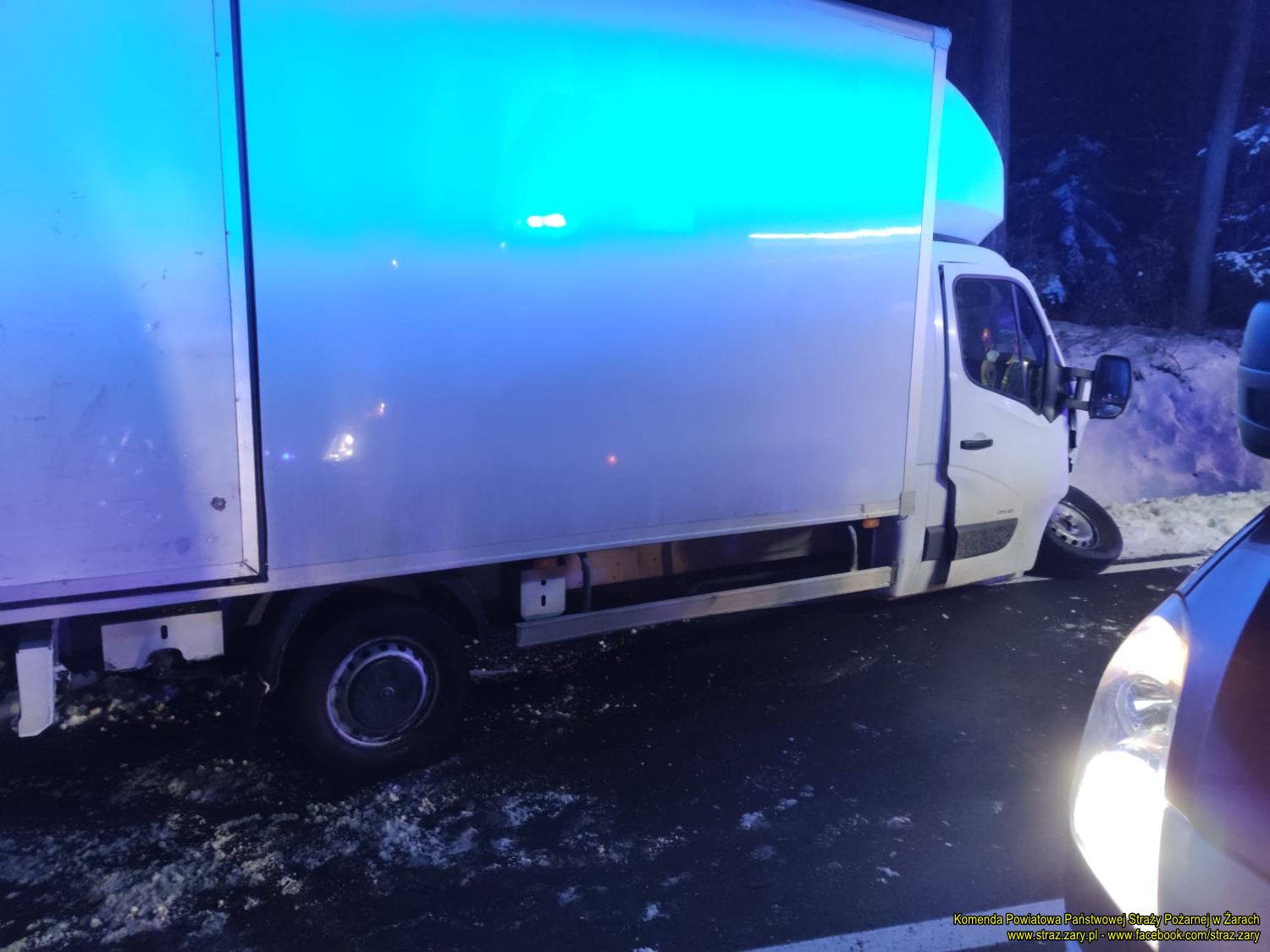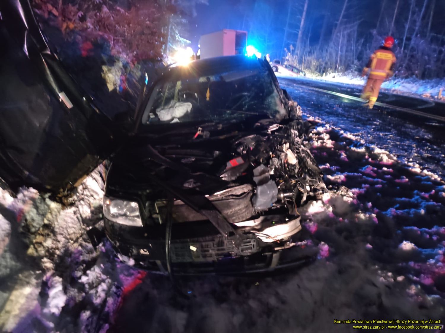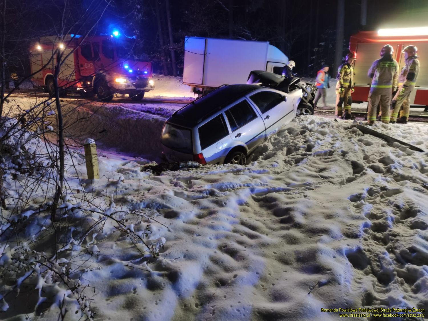 W dniu 1 lutego 2021 r. dyżurny Stanowiska Kierowania Komendanta Poiwatowego w Żarach przyjął zgłoszenie o wypadku drogowym na drodze krajowej numer 27 przy miejscowości Straszów. Natychmiast zadysponował zastępy z Jednostki Ratowniczo-Gaśniczej w Żarach i najbliższą jednostkę Ochotniczej Straży Pożarnej z Piotrowa. Z chwilą przyjazdu zastępów straży pożarnej na miejsce wypadku drogowego zastano dwa samochody osobowe i jeden samochód dostwaczy po zderzeniu czołowo- bocznym. Samochody osobowe znajdowały się w rowie. Trzeci samochód dostwaczy znajdował się częściowo na jezdni, a częściowo na poboczu drogi krajowej numer 27. Wszyscy uczestnicy zdarzenia ewakuowali się na zewnątrz pojazdów. Działania zastępów polegały na zabezpieczeniu miejsca zdarzenia, odłączeniu przewodów akumulatorów w pojazdach oraz oceną stanu osoby poszkodowanej i wdrożenie procedur KPP do czasu przybycia zespołów Zespół Ratownictwa Medycznego. Jedna osoba poszkodowana została zabrana przez ZRM na Szpitalny Oddział Ratunkowy w Żarach w związku ze złamaniem ręki.