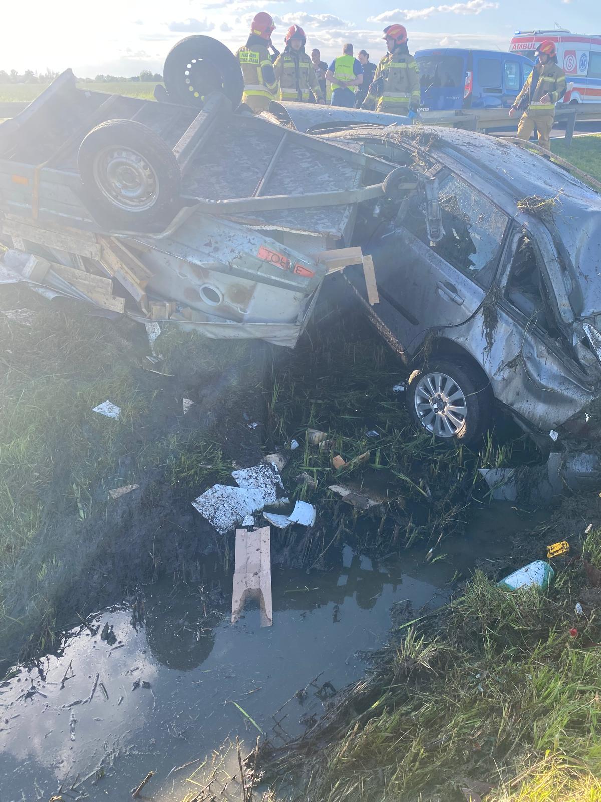 Po przybyciu strażacy zastali samochód osobowy marki Volvo z przyczepką po dachowaniu w rowie, obok znajdował się Renault Kangoo oraz dwa pojazdy ciężarowe – MAN i Mercedes. Jedna osoba została poszkodowana, jednak po przebadaniu przez zespół ratownictwa medycznego pozostała na miejscu zdarzenia. Akcja trwała ponad godzinę.
