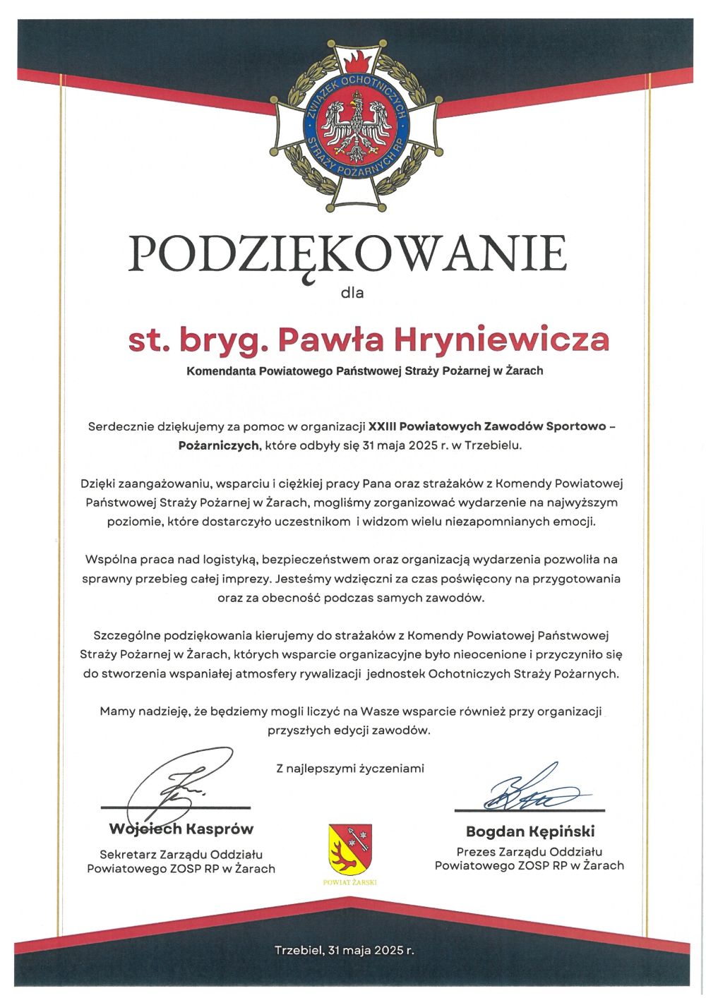 W dniu 31 maja 2025 roku na stadionie w Trzebielu odbyły się XXIII Powiatowe Zawody Sportowo-Pożarnicze, w których udział wzięło 31 drużyn, w tym 15 drużyn młodzieżowych. Zawody rozegrano w konkurencjach: sztafeta pożarnicza oraz ćwiczenia bojowe. Nad prawidłowym przebiegiem rywalizacji czuwała Komisja Sędziowska powołana przez Komendanta Powiatowego PSP w Żarach pod przewodnictwem sędziego głównego asp. Mariusza Jędrzejka - Naczelnika Wydziału Operacyjno, Kontrolno - Rozpoznawczego KP PSP w Żarach. Komendantem zawodów był dh Ryszard Główka - Prezes Ochotniczej Straży Pożarnej w Żarkach Wielkich, który wprowadził drużyny na ceremonię otwarcia i złożył meldunek o gotowości drużyn do startów dh. Bogdanowi Kępińskiemu - Prezesowi Zarzadu Odziału Powiatowego ZOSP RP w Żarach. Po wystąpieniach wspólgospodarzy zawodów: st. bryg. Pawła Hryniewicza - Komendanta Powiatowego PSP w Żarach i dh. Tomasza Sokołowskiego - Prezesa Zarzadu Odziału Gminnego ZOSP RP w Trzebielu, Wójta Gminy Trzebiel, Prezes ZOP ZOSP RP w Żarach przywitał drużyny i ogłosił otwarcie zawodów. Dzięki sprawnej organizacji , zangażowaniu zawodników i sędziów zawody przebiegły sprawnie w duchu zdrowej rywalizacji. Została ustalona kolejnosć zajetych i miejsc i zostali wyłonieni zwycięzcy w poszczególnych kategoriach. Zawody zakończyła ceremonia wręczania pucharów, medali, dyplomów i nagród.