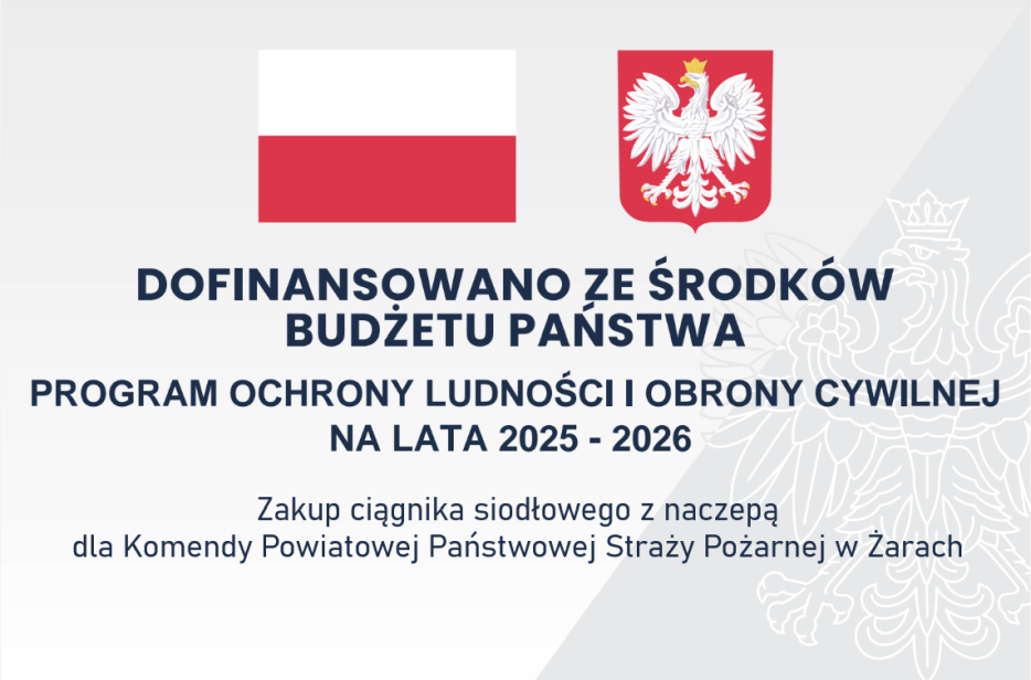 Zadanie zrealizowano na podstawie umowy z dnia 26 sierpnia 2025 r. zawartej pomiędzy Wojewodą Lubuskim, Powiatem Żarskim oraz Komendą Powiatową Państwowej Straży Pożarnej w Żarach w ramach „Programu Ochrony ludności i obrony cywilnej na lata 2025-2026” w obszarze 3 „Utrzymanie i rozwój podmiotów ochrony ludności i organizacji pozarządowych, w tym krajowego systemu ratowniczo-gaśniczego, Państwowego Ratownictwa Medycznego i jednostek ochrony przeciwpożarowej”.
