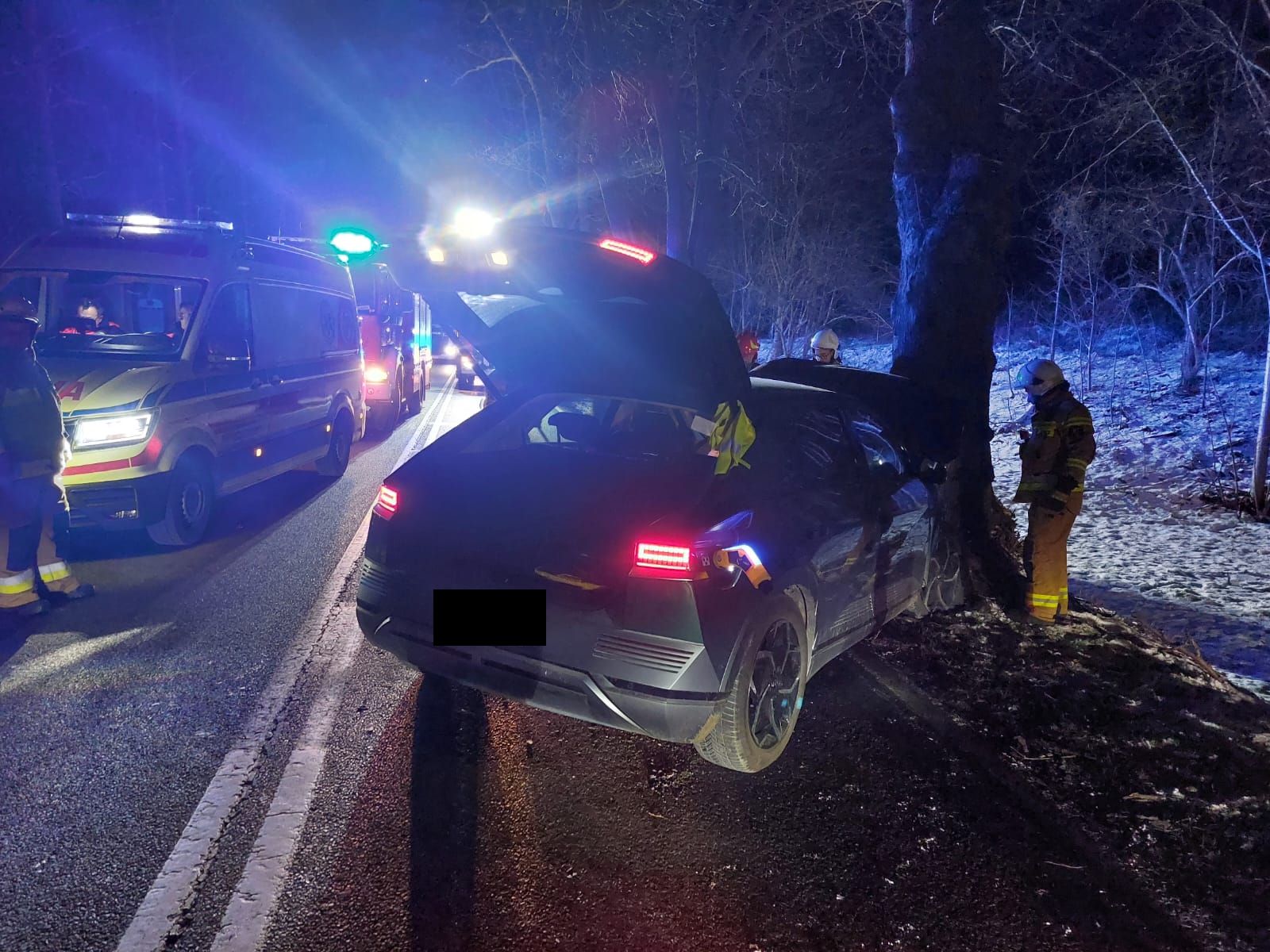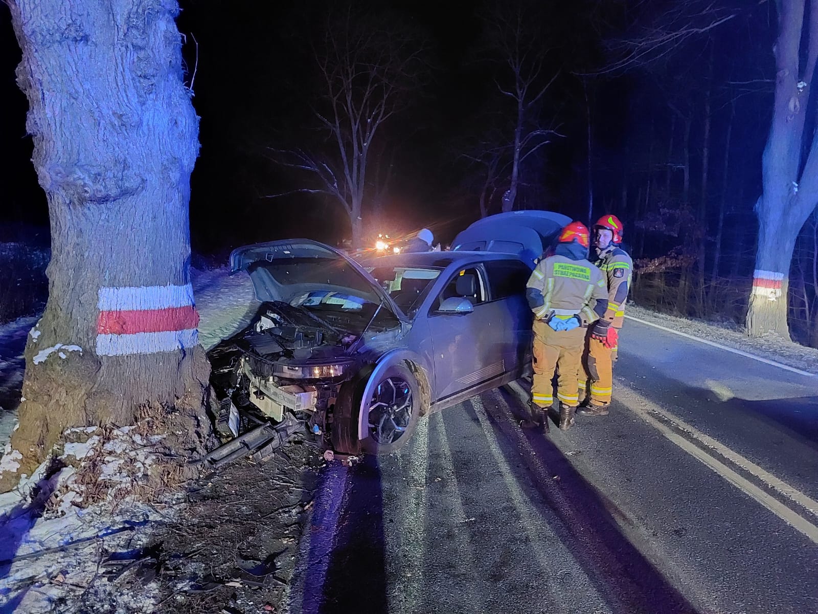 Na miejscu strażacy zastali elektryczny samochód osobowy po zderzeniu czołowym z drzewem, pojazdem podróżowała jedna osoba - kierowca. Działania zastępów polegały na zabezpieczeniu miejsca zdarzenia, wykorzystaniu wtyczki awaryjnej do odłączenia zasilania w pojazdach ratowniczych, oświetleniu terenu akcji. Osoba biorąca udział w zdarzeniu po przebadaniu przez ZRM pozostała na miejscu.