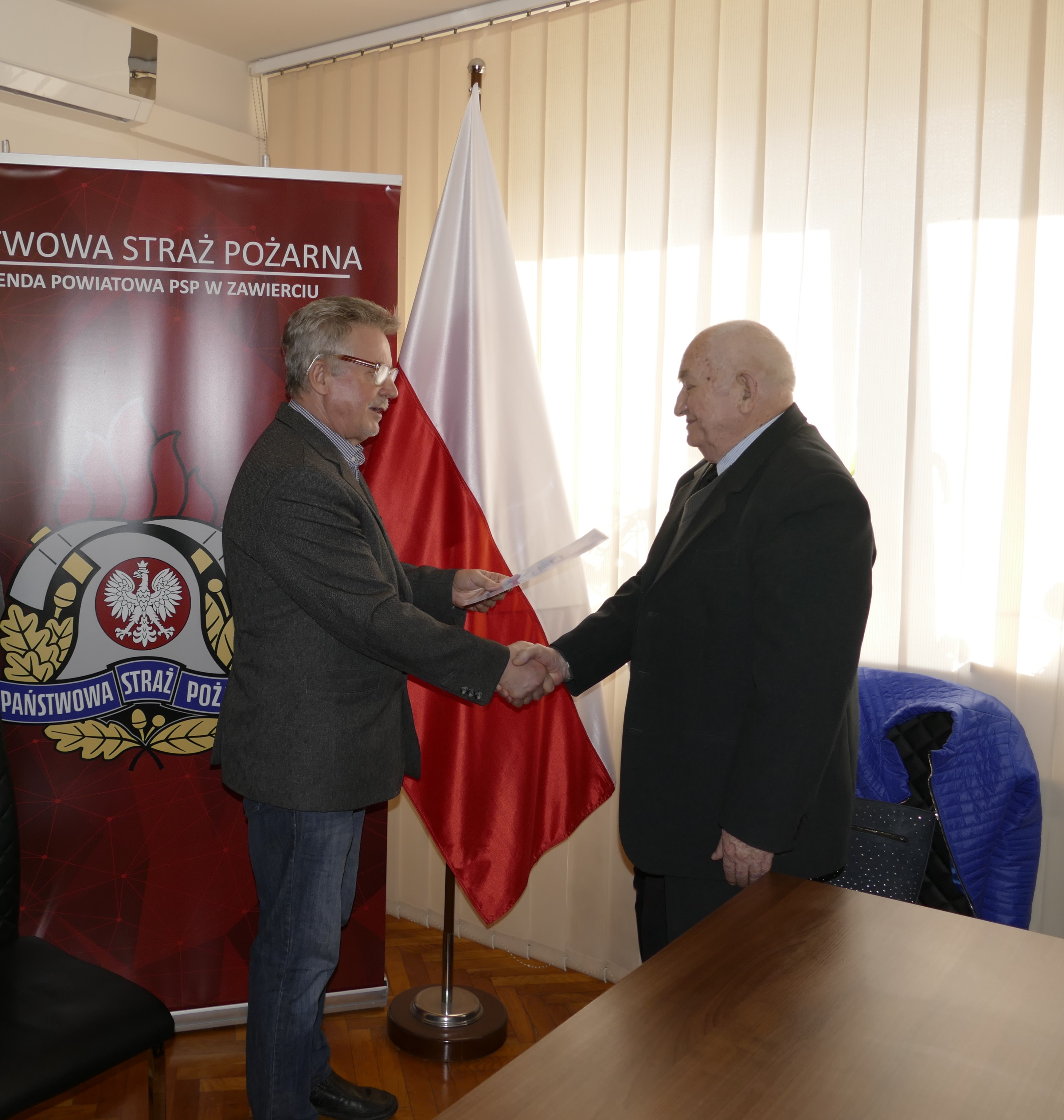 W trakcie spotkania Komendant Powiatowy Państwowej Straży Pożarnej w Zawierciu razem z Prezesem Związku Emerytów i Rencistów Pożarnictwa RP działającym przy tut. Komendzie Panem Zbigniewem Bakalarzem, złożyli serdeczenie życzenia z okazji jubileuszu 80-tych urodzin: