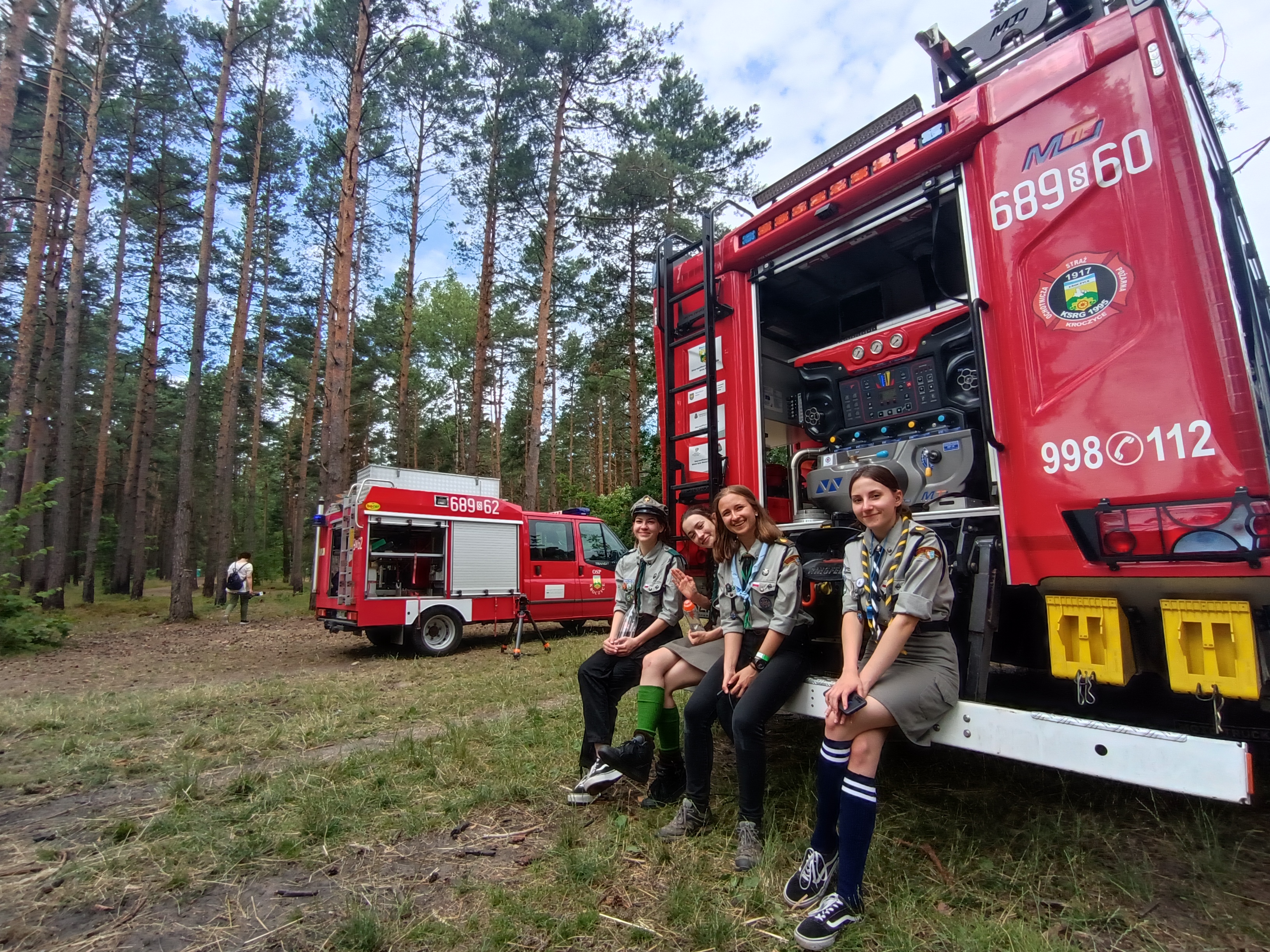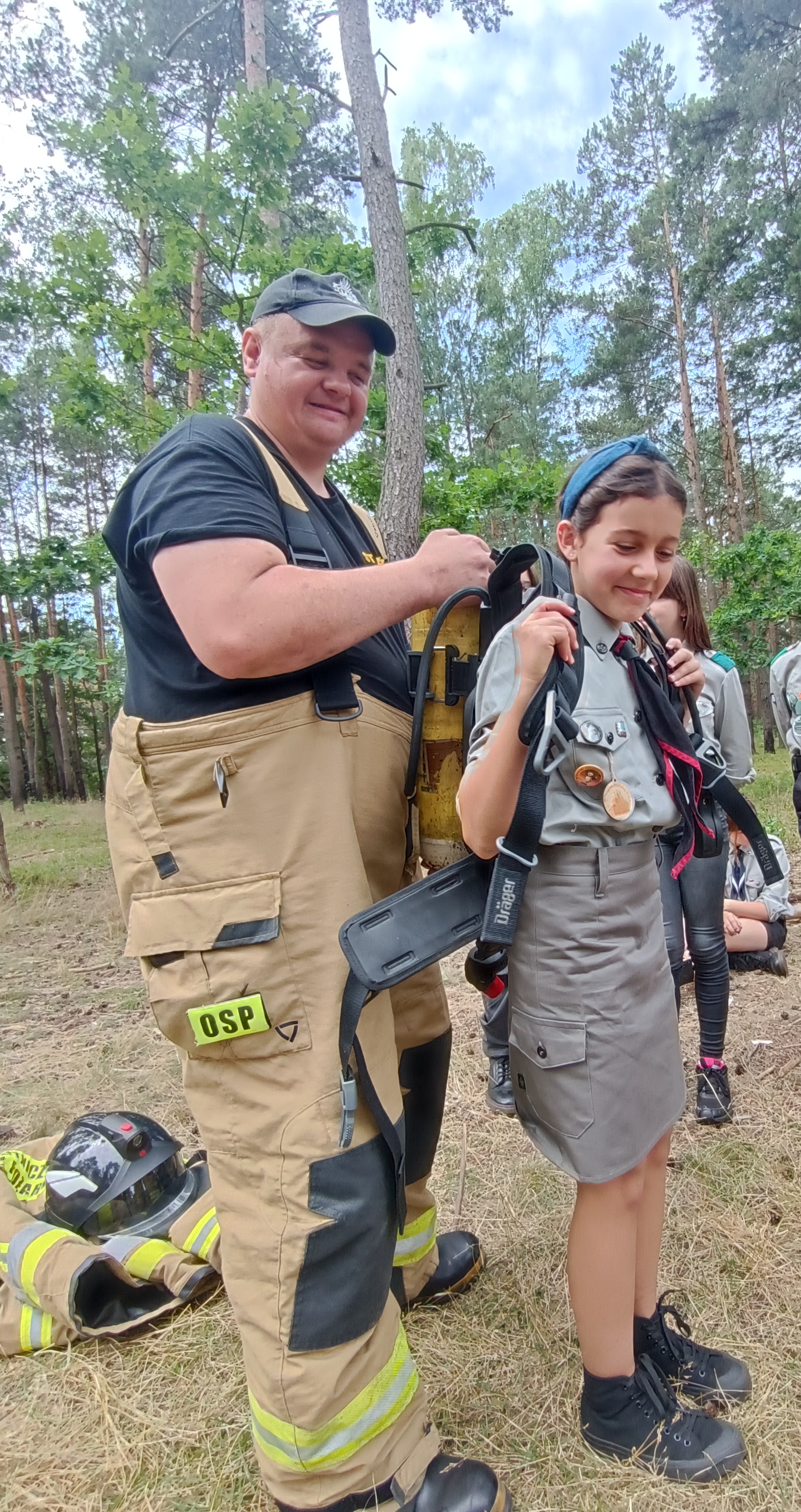 Końcowym punktem kontroli było zapoznanie ze sprzętem jaki strażacy wykorzystują podczas akcji ratowniczo-gaśniczych. W trkacie prezentacji strażacy odpowiadali na wszystkie pytania obozowiczów, była również możliwość przymierzenia ubrania specjalnego czy też aparatu ochrony dróg oddechowych.