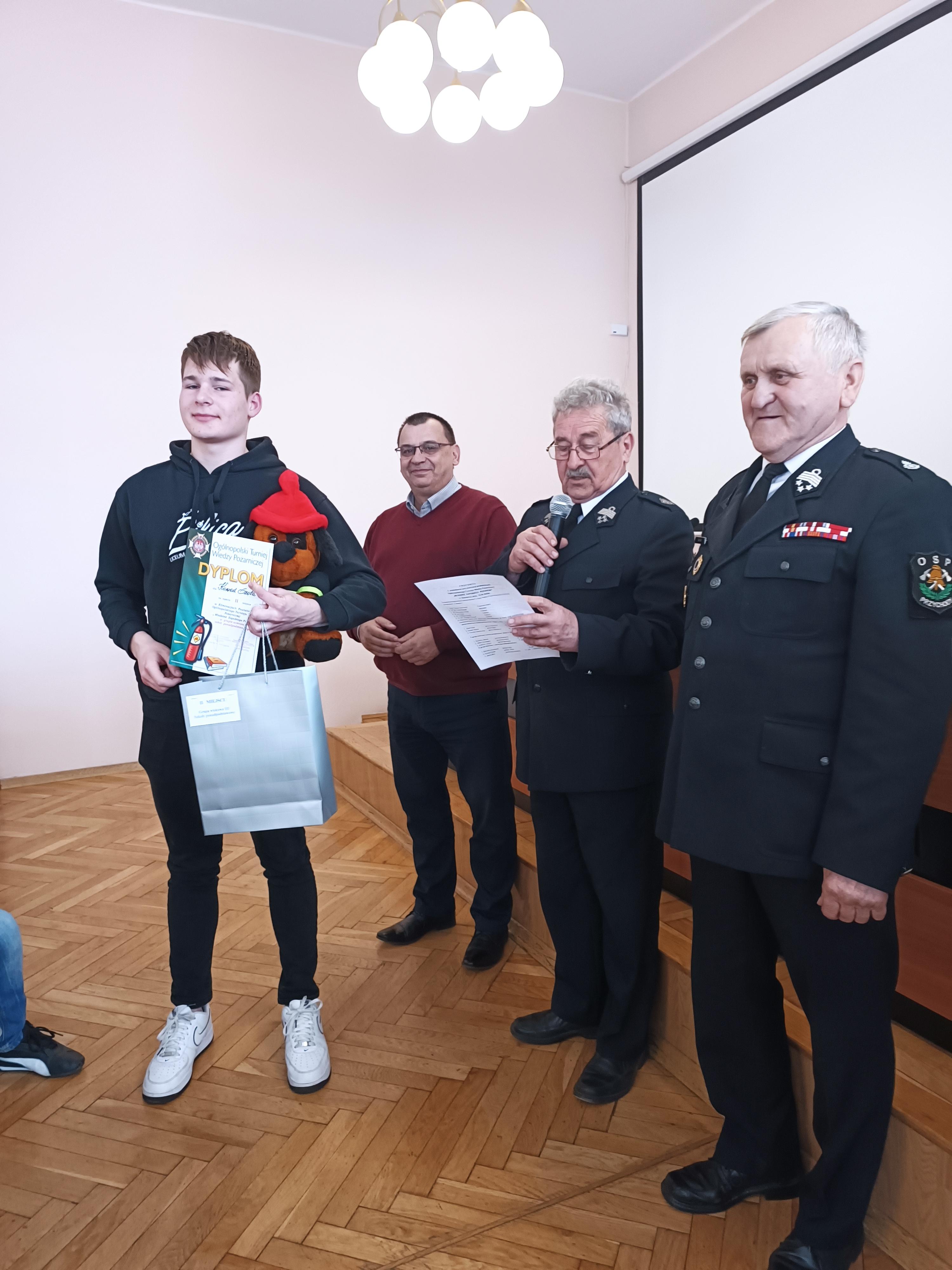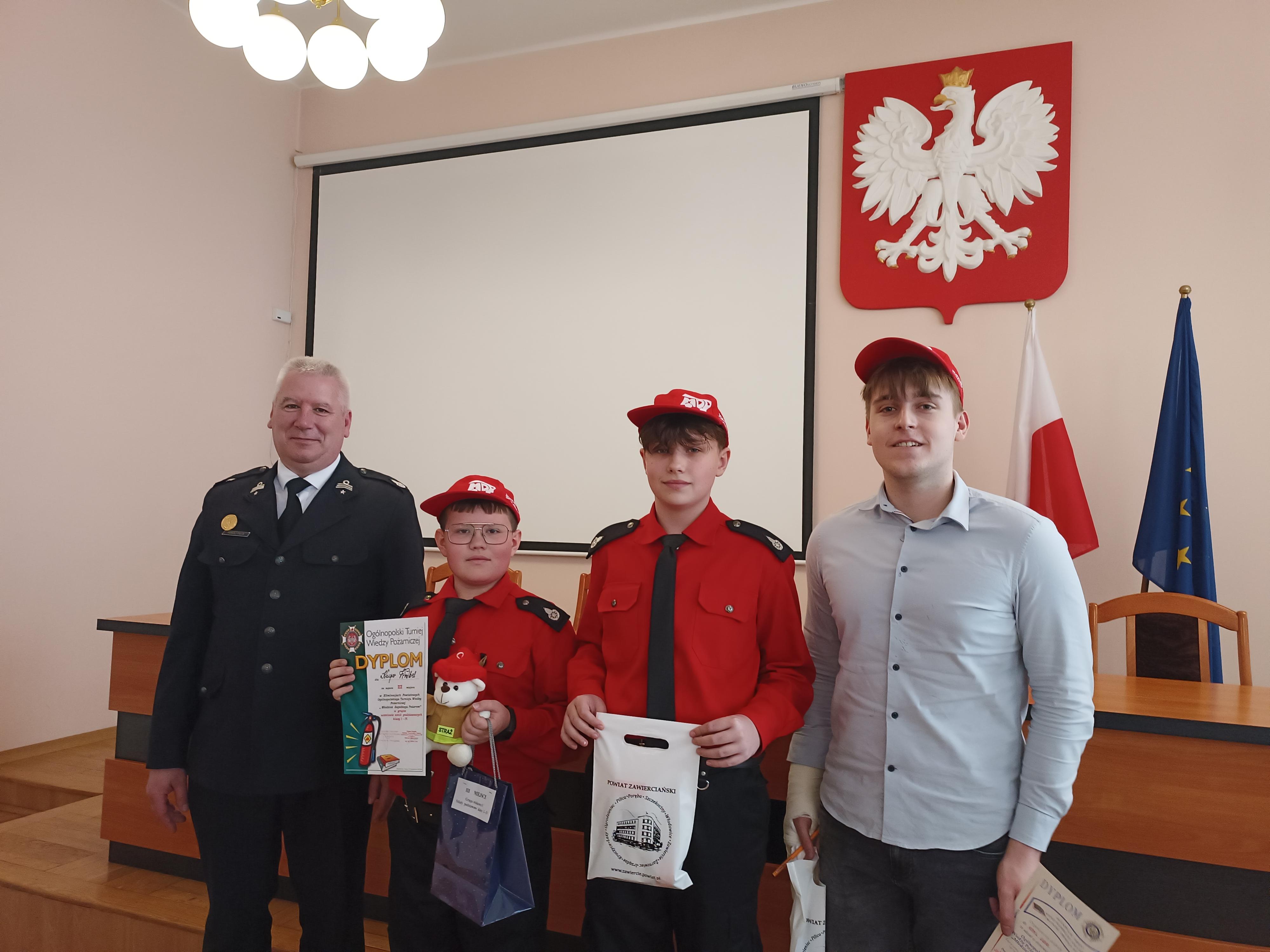 Nagrody rzeczowe dla laureatów turnieju oraz pozostałych uczestników, zostały ufundowane przez Komendę Powiatową Państwowej Straży Pożarnej w Zawierciu oraz przez Starostwo Powiatowe w Zawierciu. Serdeczne gratulacje należą się nie tylko zwycięzcom, ale również wszystkim uczestnikom turnieju. Zakres wiedzy, który obejmują pytania jest bardzo szeroki. Pytania dotyczą wielu aspektów strażackiego fachu, od wiedzy ogólnej, historycznej przez operacyjną, a także zagadnienia związane ze sprzętem wykorzystywanym przez jednostki straży pożarnej. Zwycięzcy poszczególnych kategorii wiekowych wygrywając eliminacje powiatowe uzyskali awans do rozgrywek na szczeblu wojewódzkim. Życzymy powodzenia w dalszym etapie konkursu !