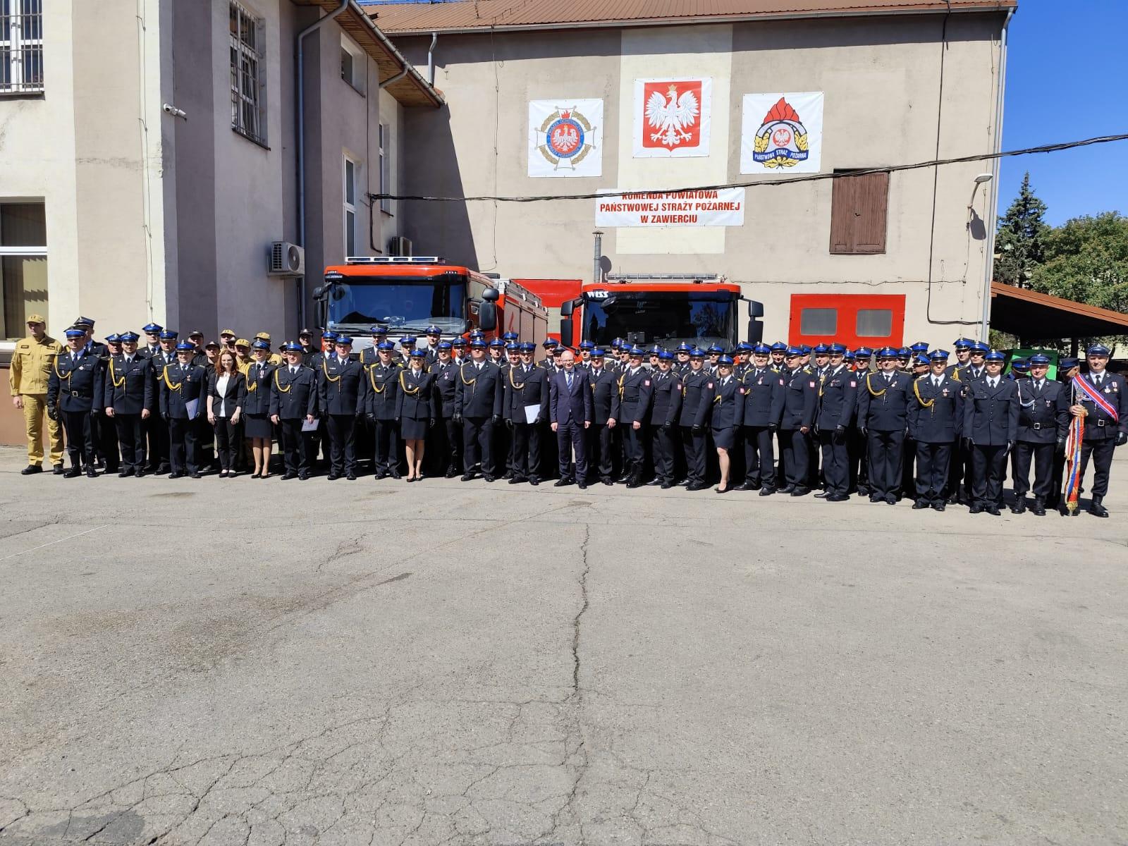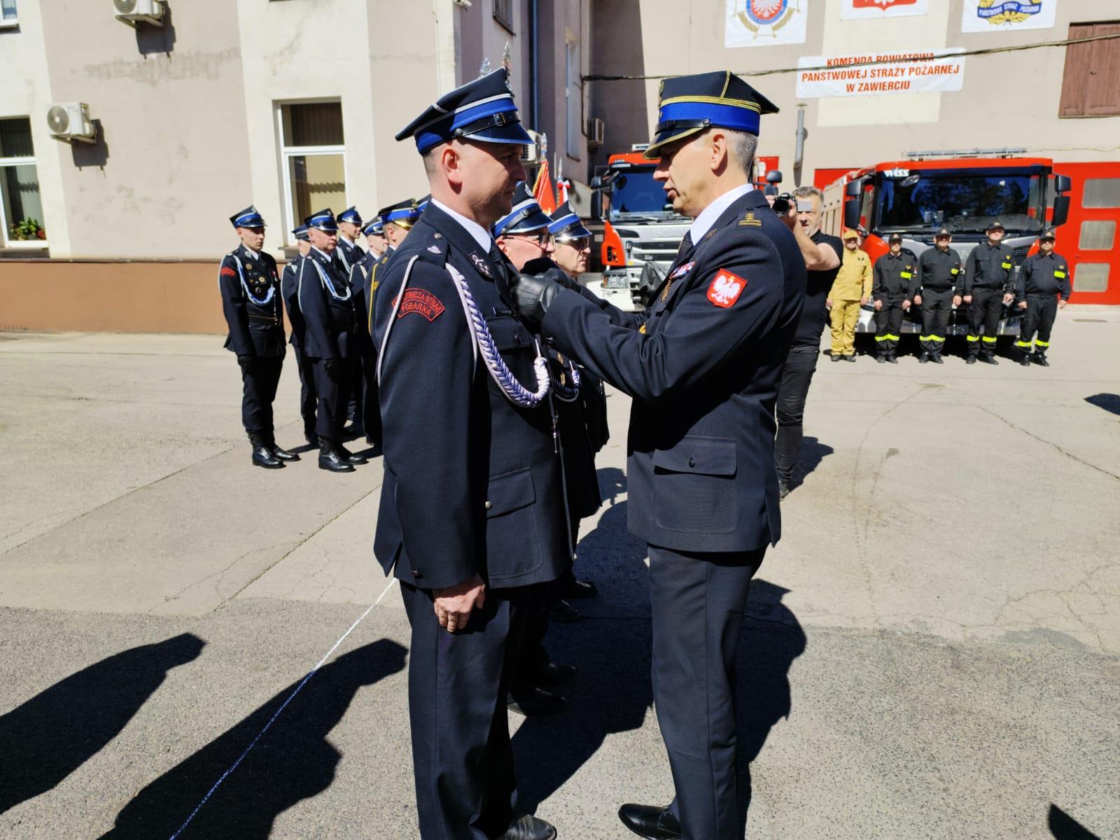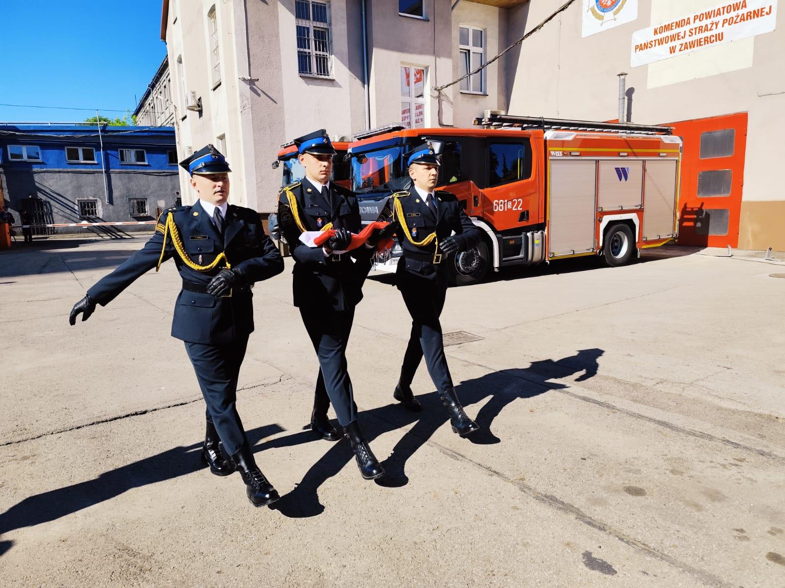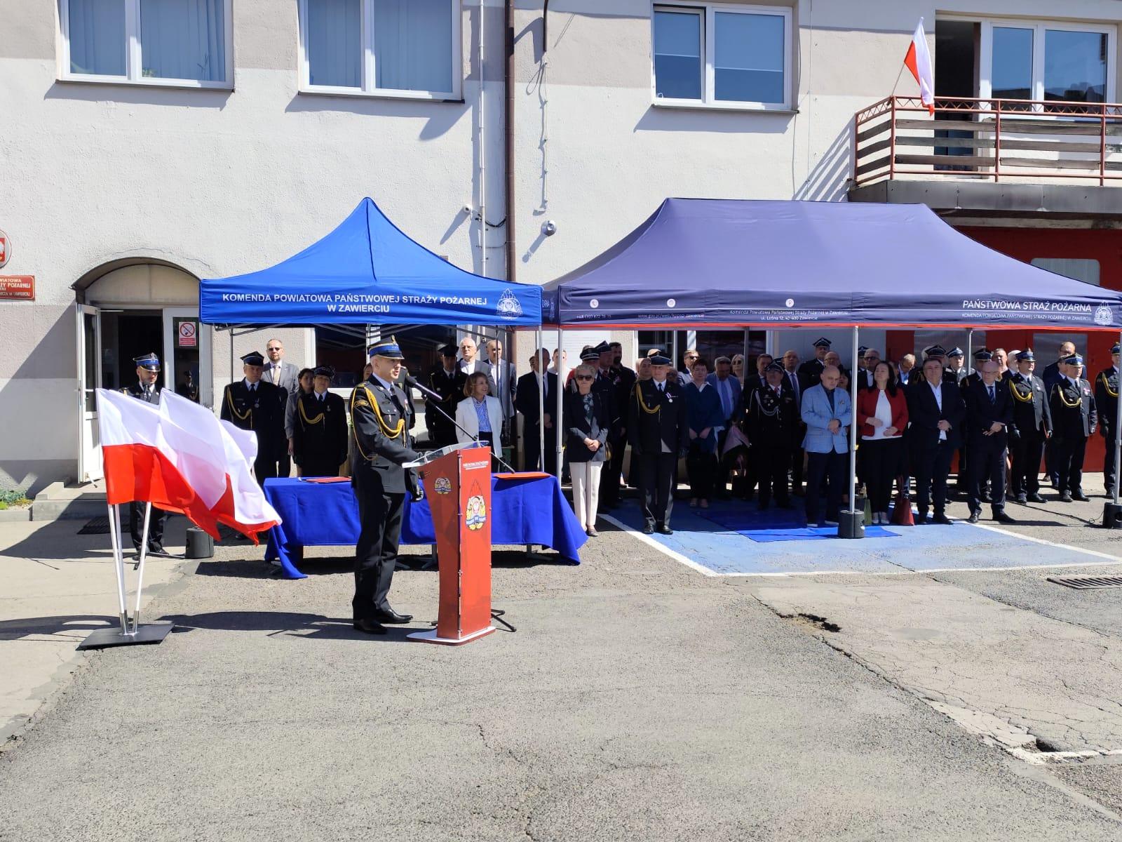 We wtorek 14 maja o godzinie 10:00 na placu wewnętrznym Komendy Powiatowej PSP w Zawierciu odbyły się Powiatowe obchody Dnia Strażaka. Podczas uroczystości wręczono awanse na wyższe stopnie służbowe oraz odznaczenia i wyróżnienia dla funkcjonariuszy Komendy Powiatowej PSP w Zawierciu. Po złożeniu meldunku przez dowódcę dzisiejszej uroczystości st. kpt. Karola Skorupę Zastępcy Ślaskiego Komendanta Wojewódzkiego st. bryg. Romanowi Klecha, nastąpiło uroczyste podniesienie flagi państwowej i odśpiewanie hymnu państwowego. Swoją obecnością uroczystość zaszczycili: