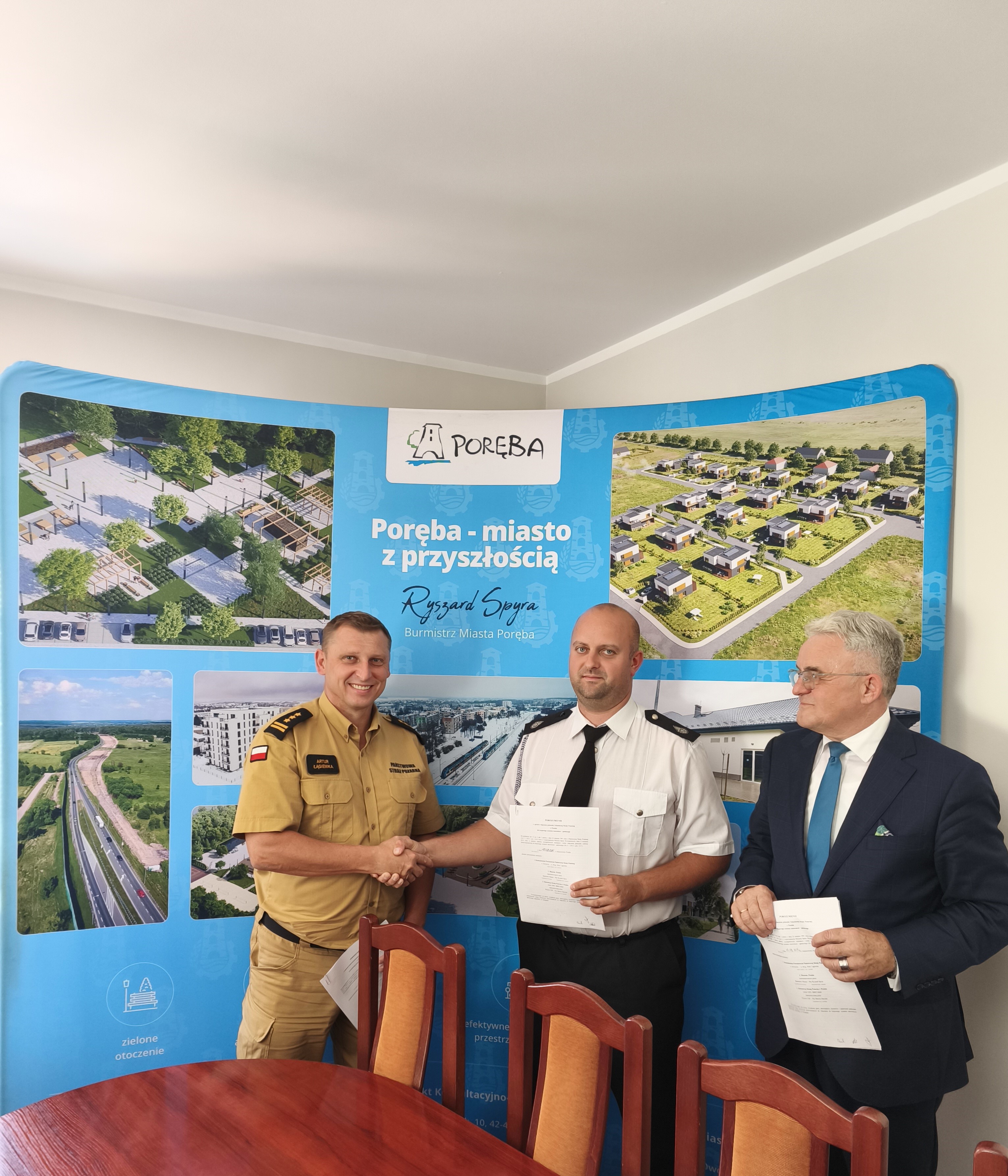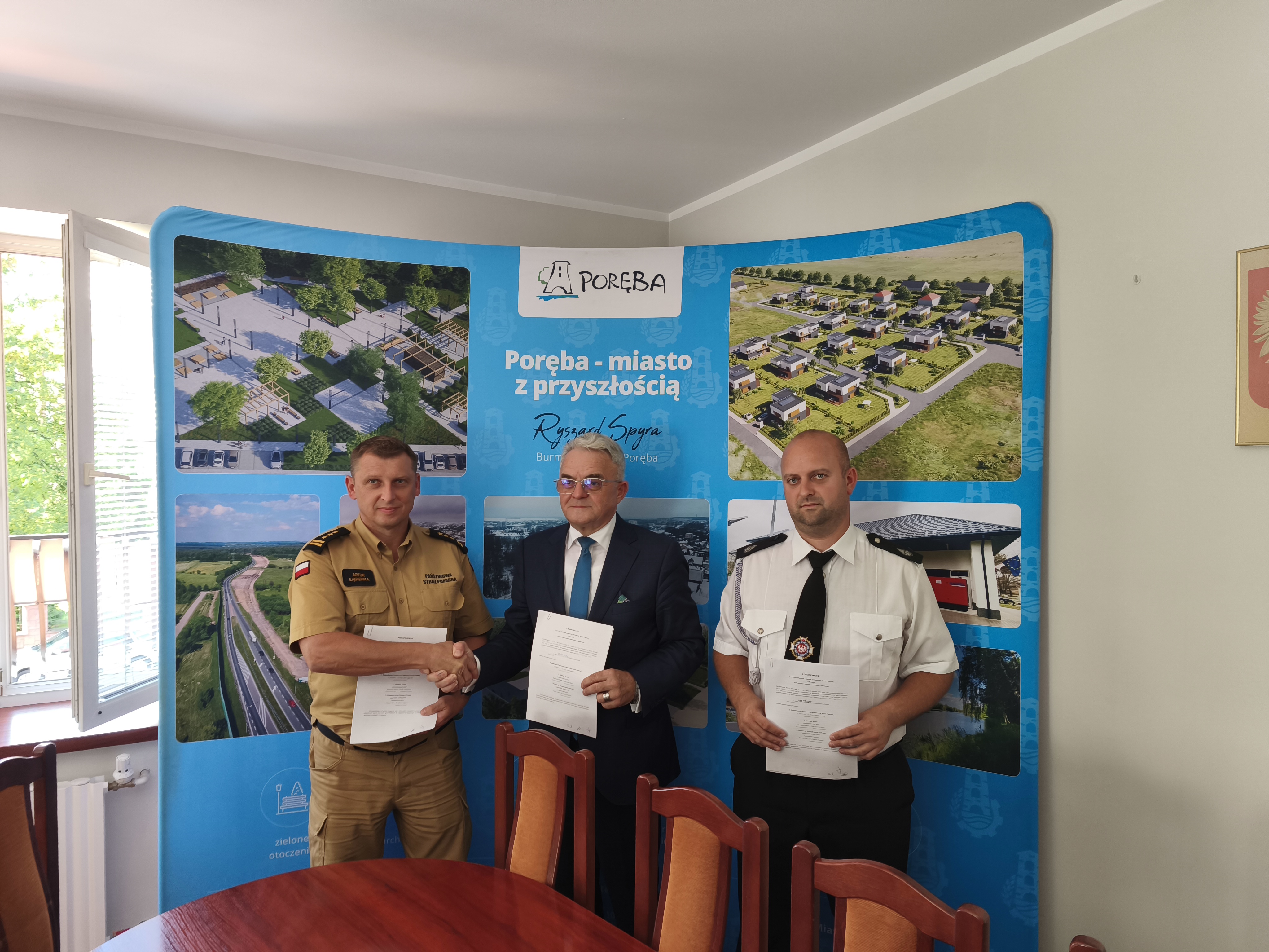 Dziś w siedzibie Miasta Poręba zostało podpisane Trójstronne porozumienie w sprawie włączenia jednostki Ochotniczej Straży Pożarnej w Porębie do Krajowego Systemu Ratowniczo – Gaśniczego. Porozumienie podpisali Komendant Powiatowy Państwowej Straży Pożarnej w Zawierciu st. bryg. Artur Łągiewka, Burmistrz Miasta Poręba Pan Ryszard Spyra oraz Prezes Ochotniczej Straży Pożarnej w Porębie dh Marcin Darocha. Porozumienie zawarte na najbliższych 5 lat zawiera m.in. deklarowaną gotowość operacyjną, zadania przewidziane dla jednostki, sposób utrzymania oraz alarmowania, a także ilość i wyszkolenie ratowników.
