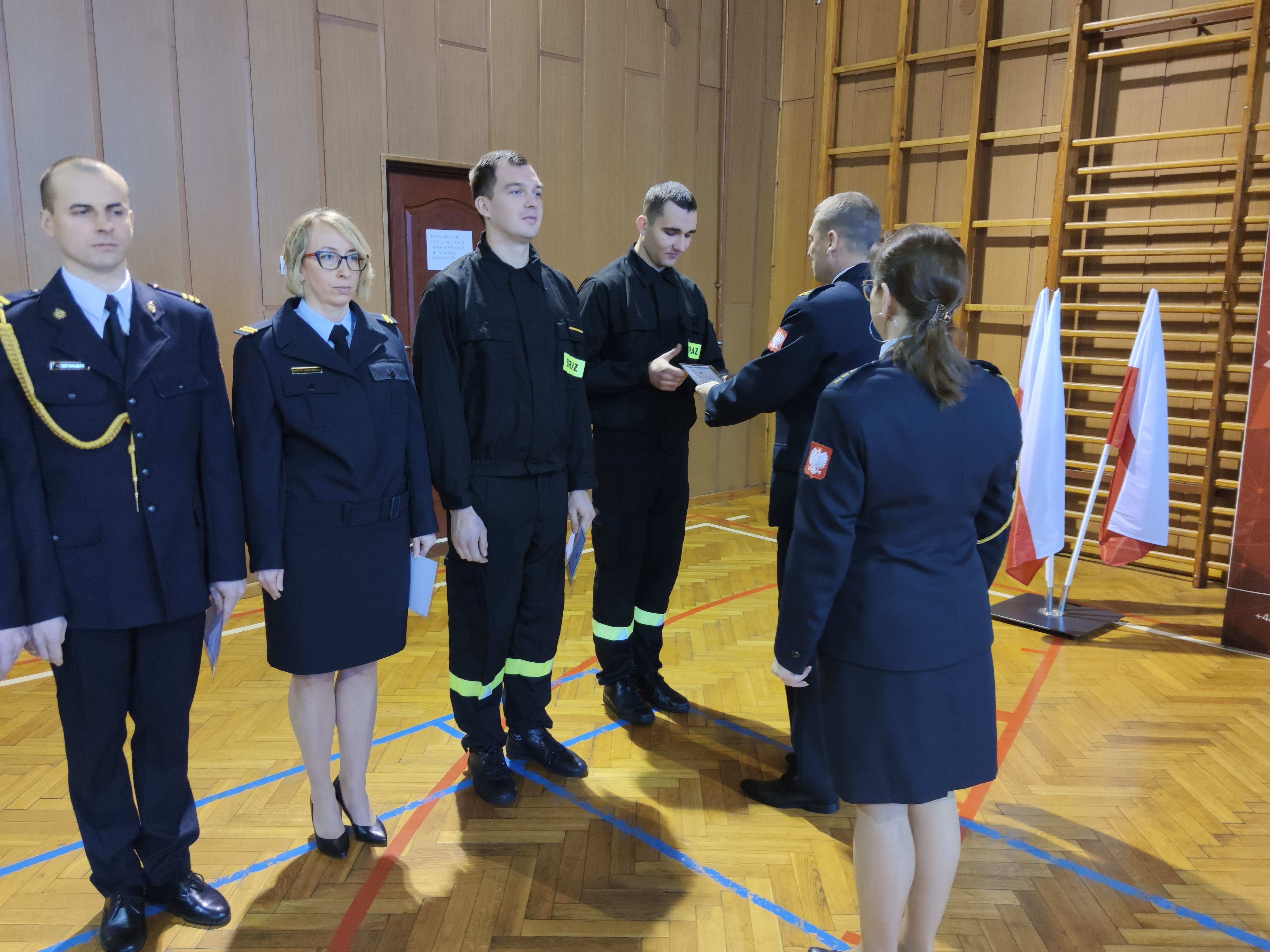 „Ja, obywatel Rzeczypospolitej Polskiej, świadom podejmowanych obowiązków strażaka, uroczyście ślubuję być ofiarnym i mężnym w ratowaniu zagrożonego życia ludzkiego i wszelkiego mienia – nawet z narażeniem życia. Wykonując powierzone mi zadania, ślubuję przestrzegać prawa, dyscypliny służbowej oraz wykonywać polecenia przełożonych. Ślubuję strzec tajemnic związanych ze służbą, a także honoru, godności i dobrego imienia służby oraz przestrzegać zasad etyki zawodowej.”