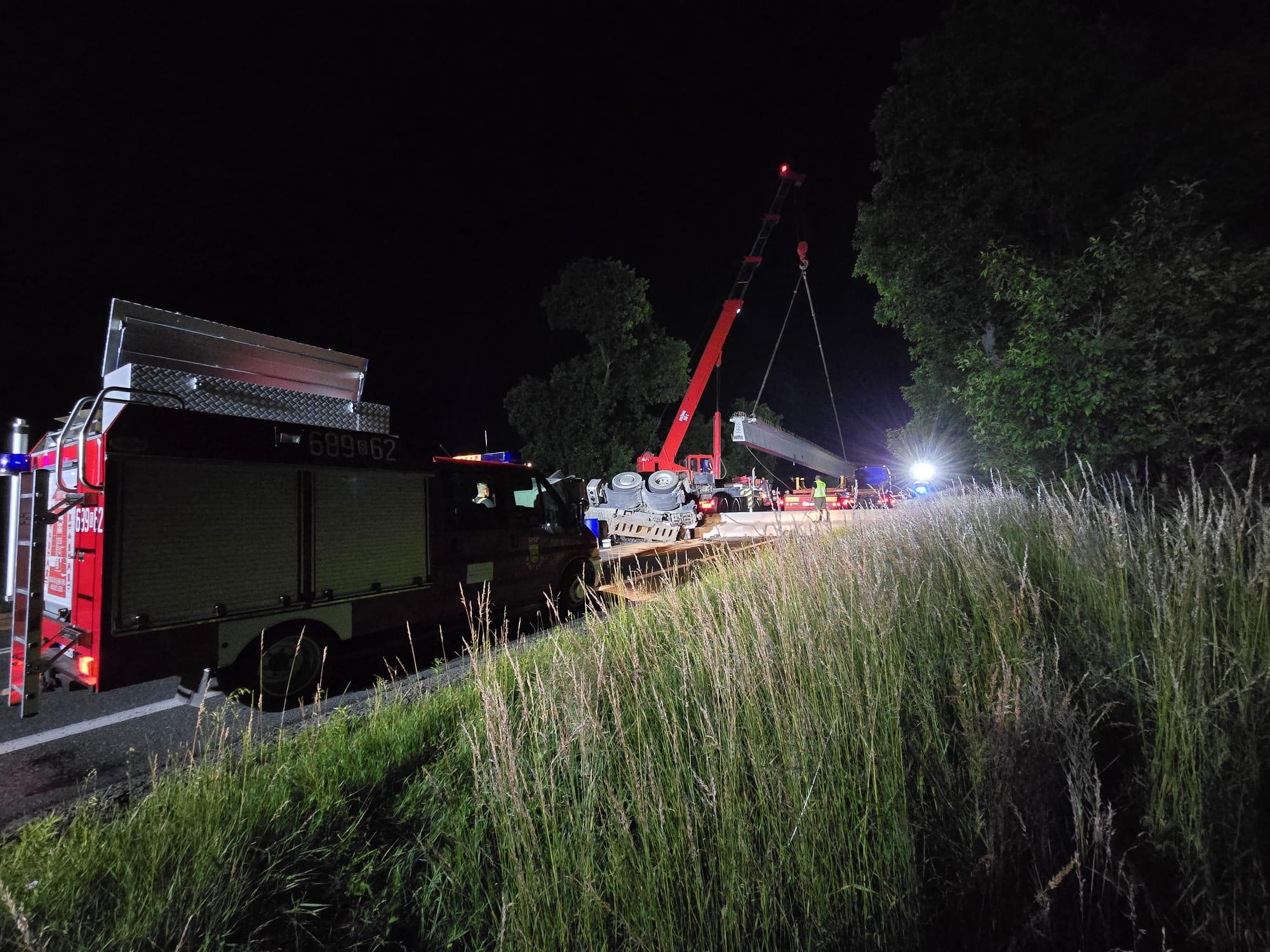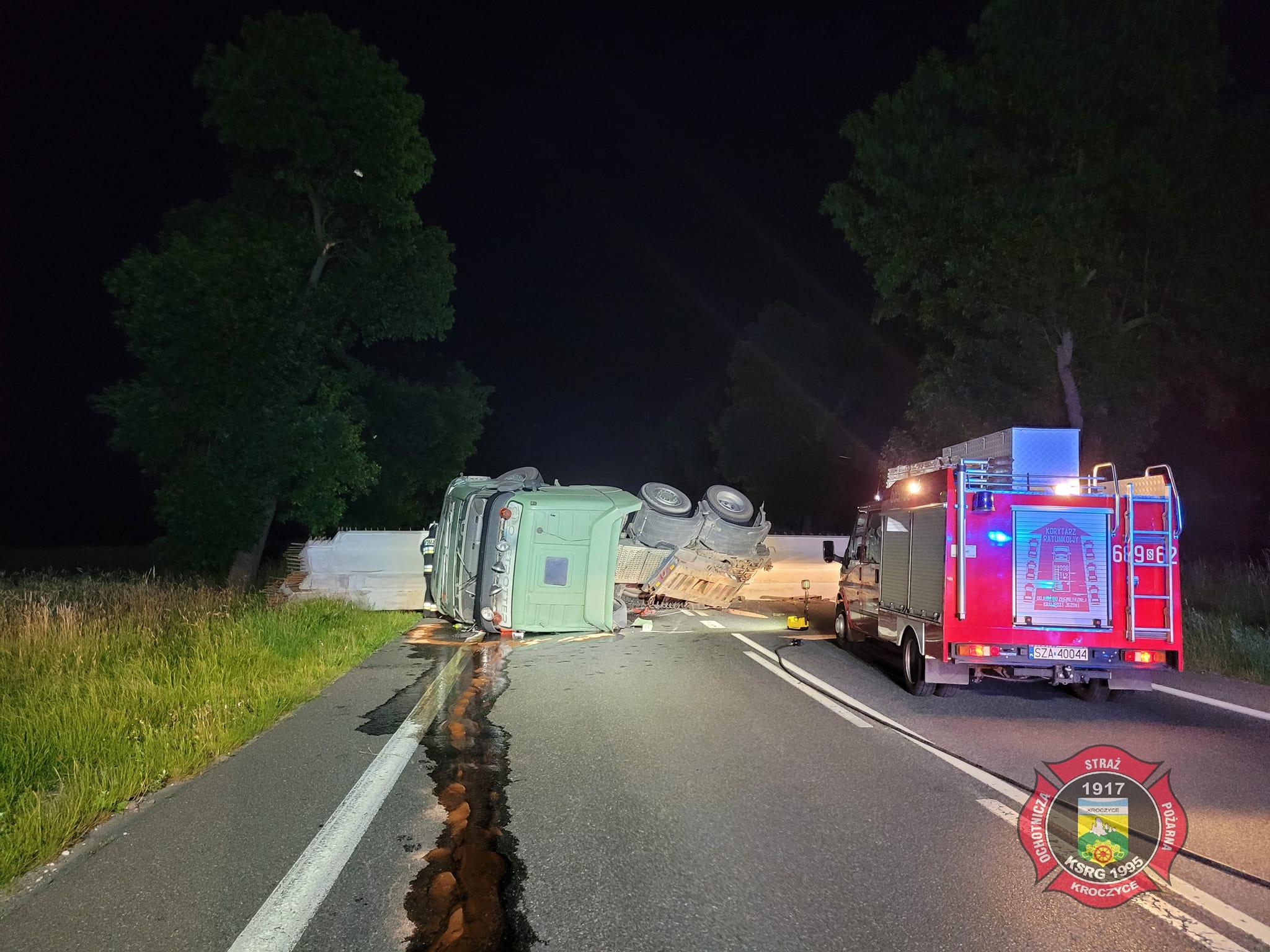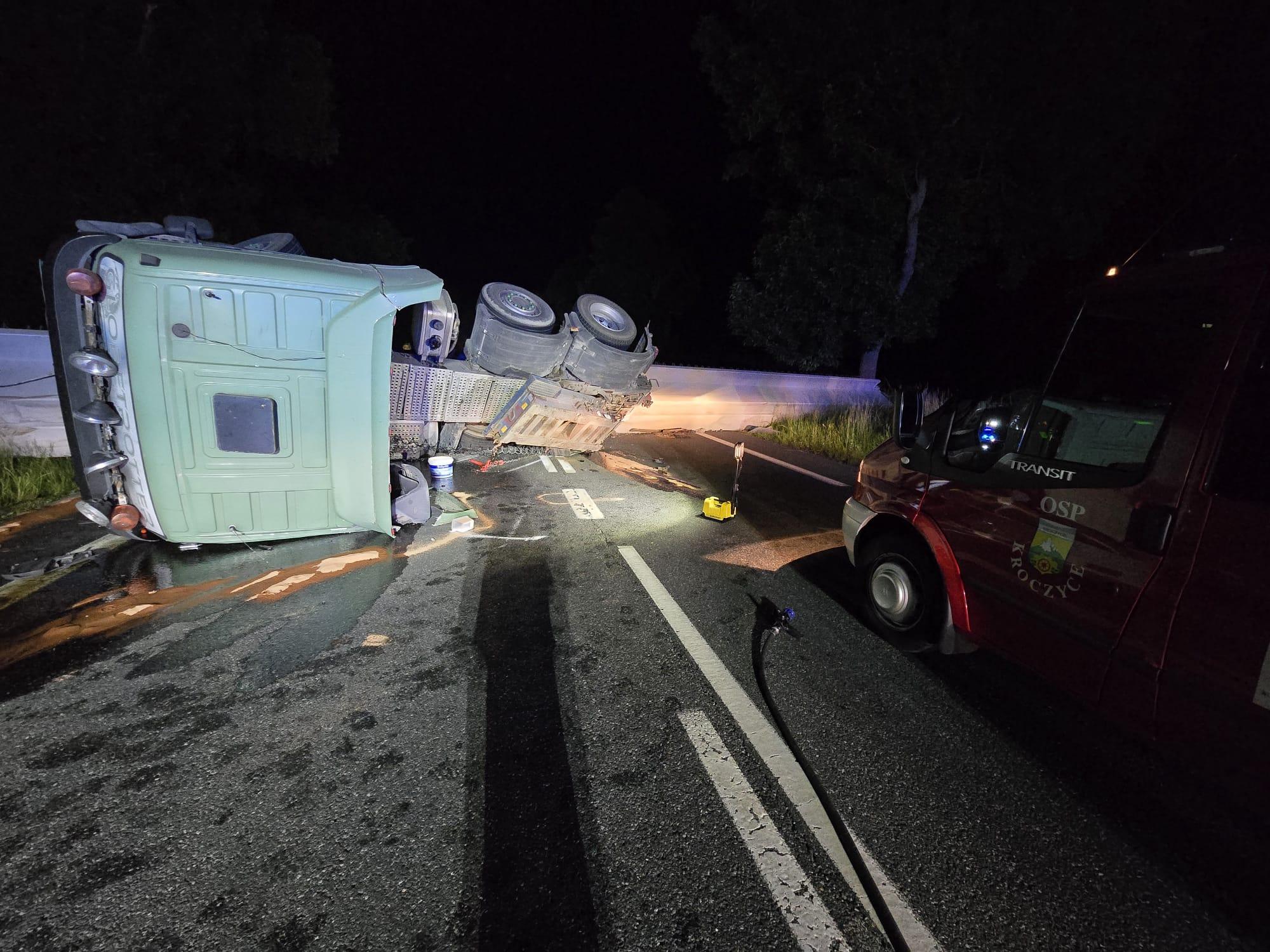 Po dojeździe zastępów na miejsce zdarzenia stwierdzono leżący na boku samochód ciężarowy wraz z ładunkiem w postaci betonowych elementów konstrukcyjnych mostu. W wyniku tego zdarzenia kierujący pojazdem został poszkodowany. Przybyły na miejsce zespół ratownictwa medycznego, przetransportował poszkodowanego do szpitala z obrażeniami nie zagrażającymi jego życiu. W tym miejscu należy wspomnieć o wzorowym zachowaniu druha oraz druhny z jednostki OSP Karlin, którzy będąc świadkami zdarzenia natychmiast zaalarmowali służby ratunkowe i do czasu przybycia na miejsce ZRM udzielali pierwszej pomocy osobie poszkodowanej zaopatrując obrażenia.