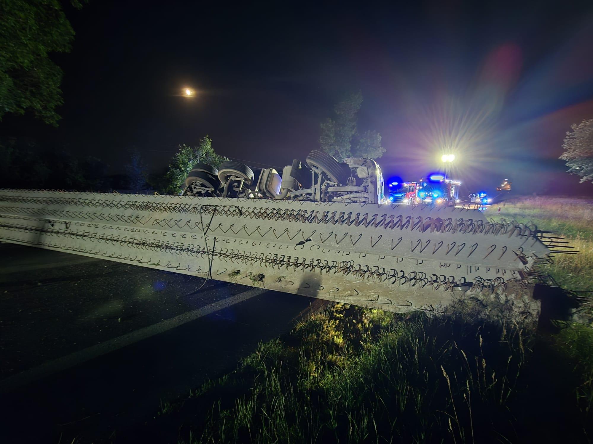 Wypadek samochodu ciężarowego przewożącego elementy konstrukcyjne mostu