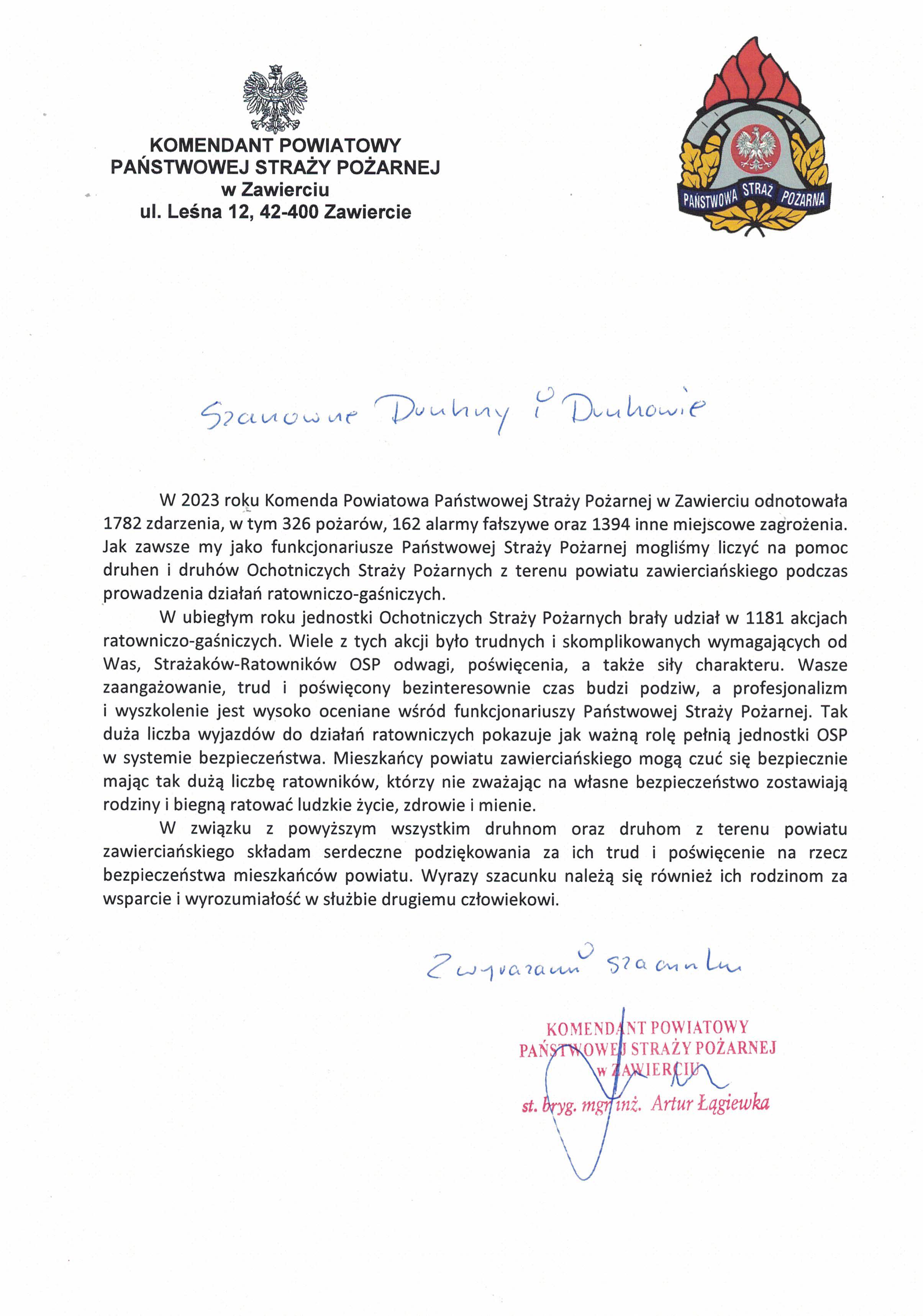 W trakcie ubiegłego roku strażacy z jednostek OSP brali udział w 1181 zdarzeniach na terenie całego powiatu. Ta liczba pokazuje jak prężnie działają druhowie na terenie naszego powiatu. Wyrażając podziw oraz podziękowanie dla druhen oraz druhów OSP, Komendant Powiatowy Państwowej Straży Pożarnej w Zawierciu skierował list, który został umieszczony poniżej.