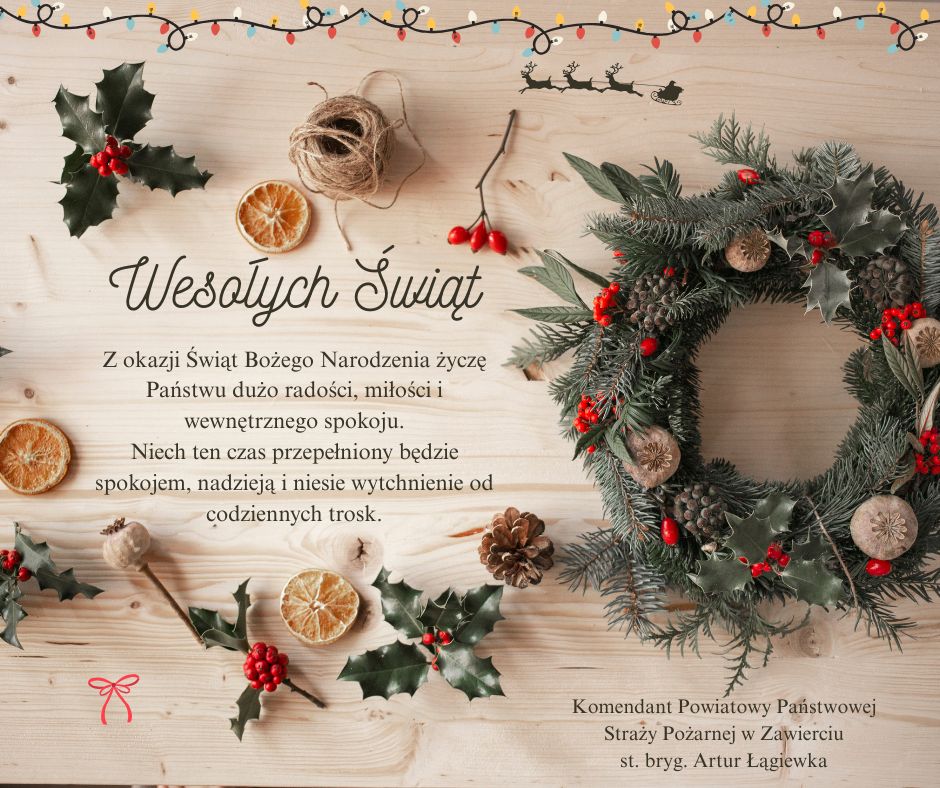 Życzenia Komendanta Powiatowego Państwowej Straży Pożarnej w Zawierciu, z okazji Świąt Bożego Narodzenia 23.12.2025 Zdjęcia (1) Pokaż zdjęcie 1 z galerii.