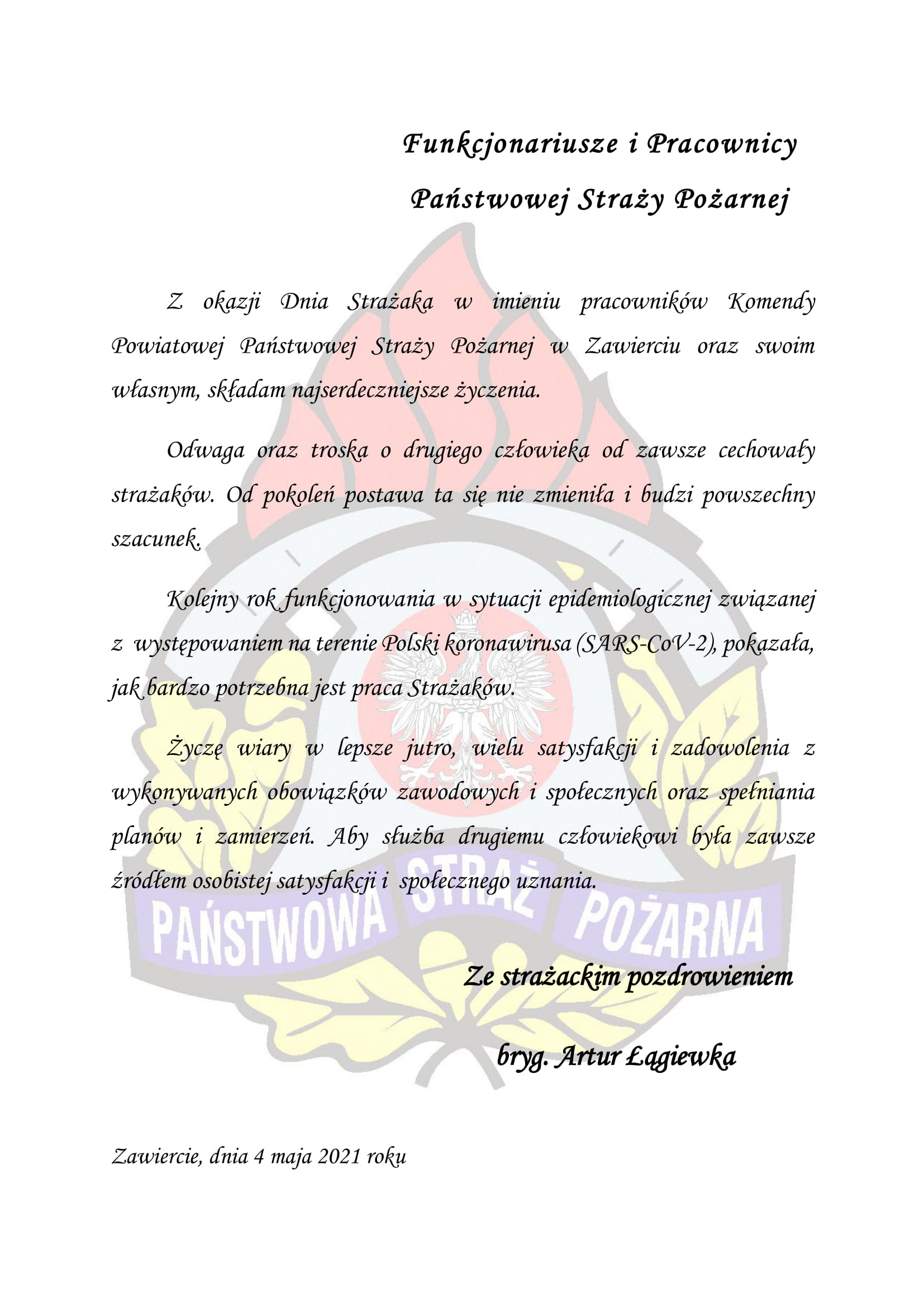 Życzenia Komendanta Powiatowego PSP w Zawierciu