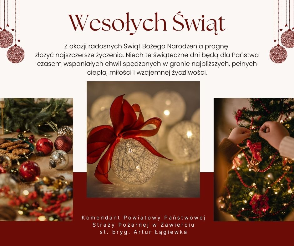 Życzenia Komendanta Powiatowego Państwowej Straży Pożarnej w Zawierciu st. bryg. Artura Łągiewki z okazji nadchodzących Świąt Bożego Narodzenia.