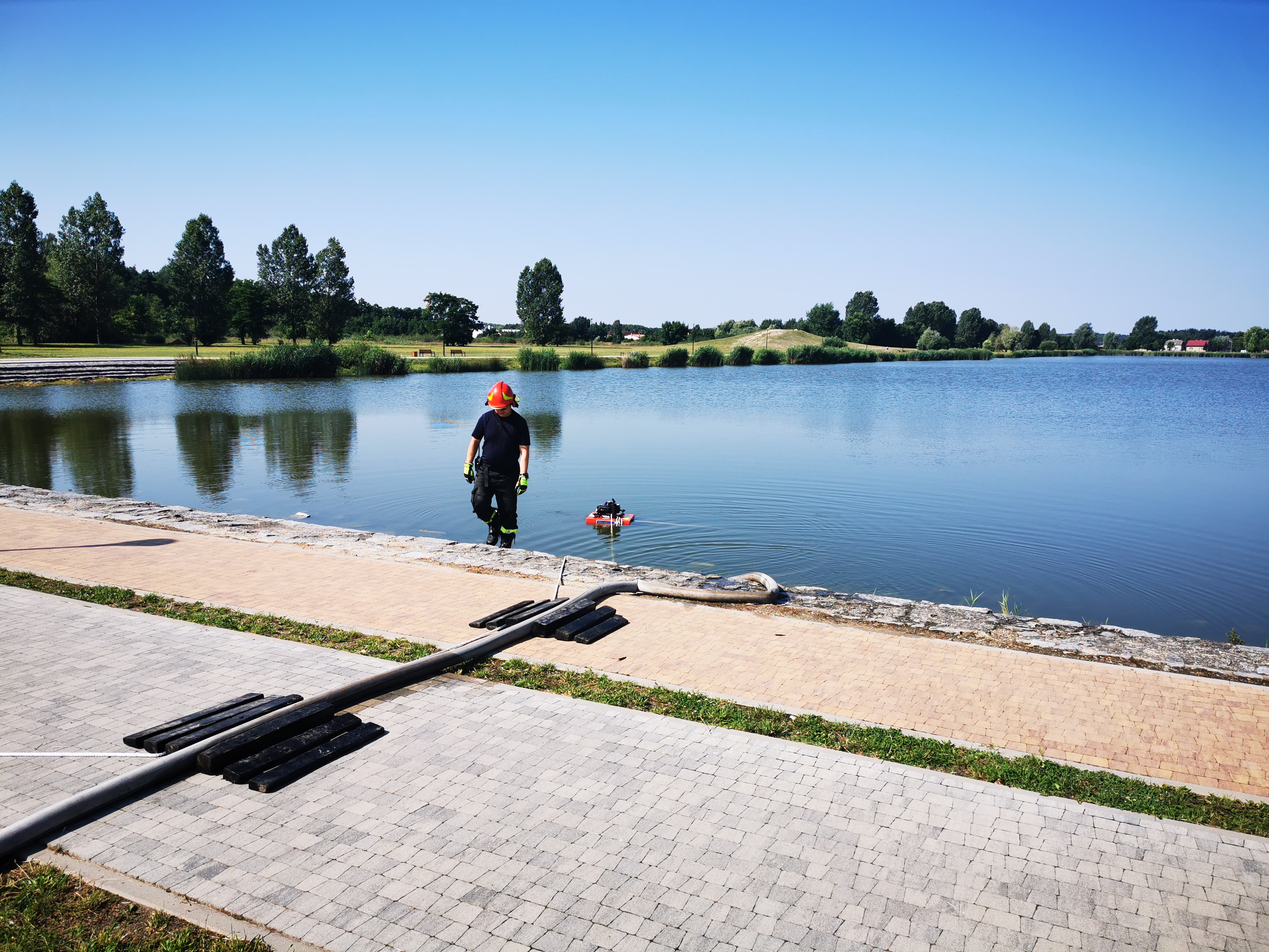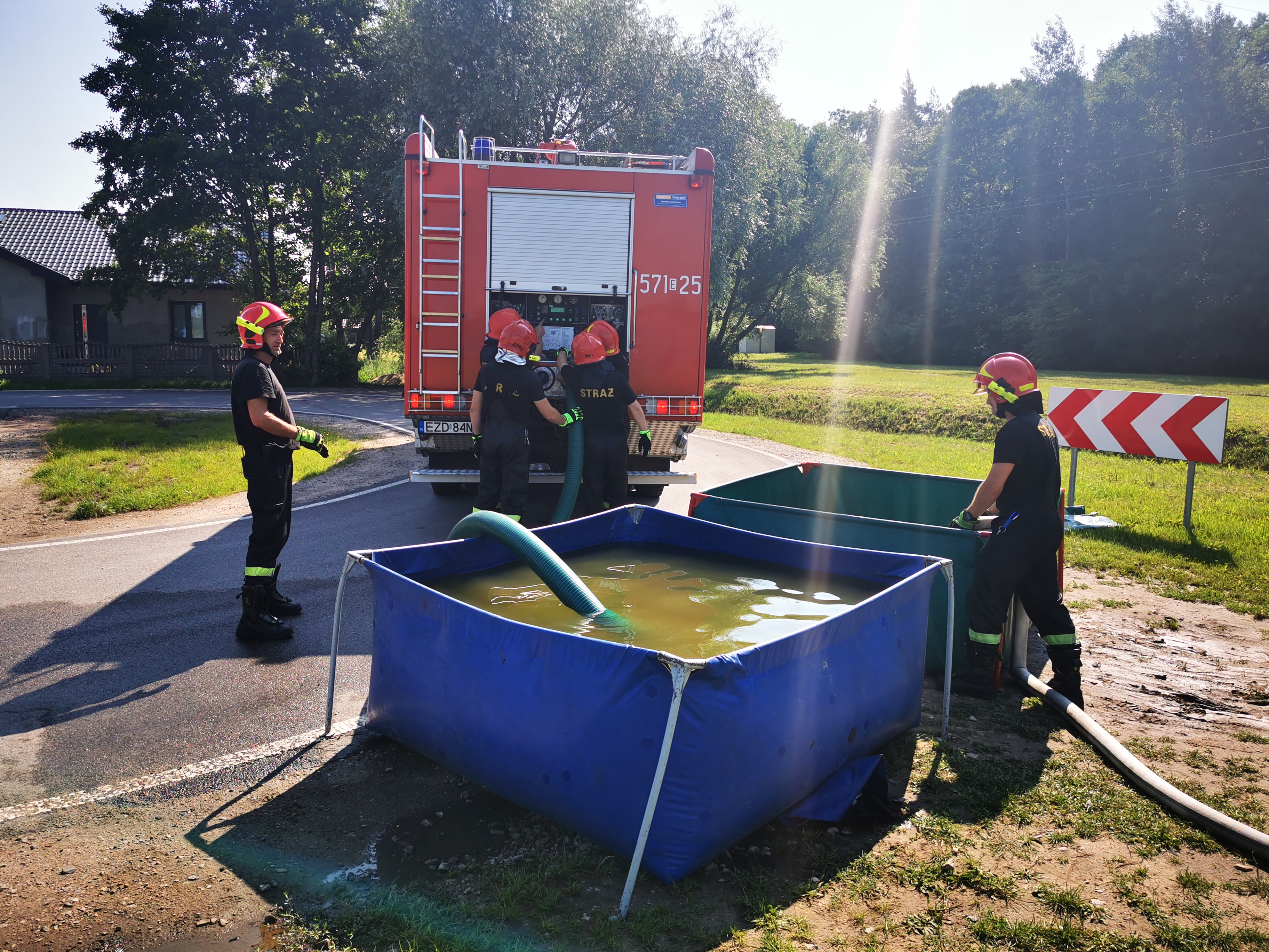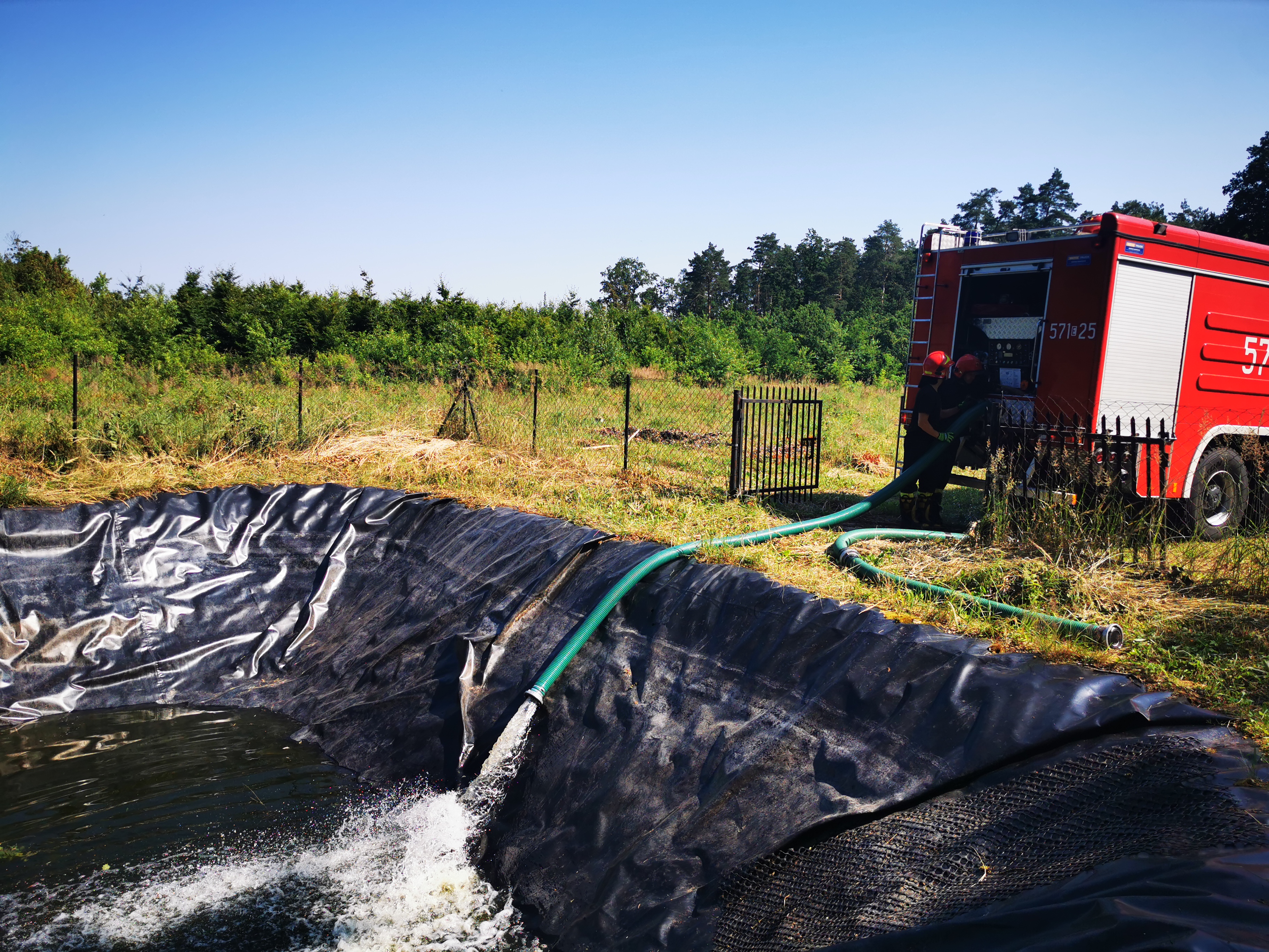 W dniach 13-15.07.2021 r. zostały zorganizowane wspólne ćwiczenia JRG PSP w Zduńskiej Woli z Nadleśnictwem Kolumna z zakresu zabezpieczenia przeciwpożarowego terenów leśnych. Głównym założeniem ćwiczeń było przemieszczanie wody na duże odległości. Scenariusz zakładał, że pali się las w rejonie miejscowości Świerzyny, a woda w punkcie czerpania wody skończyła się i celem usprawnienia tankowania wozów bojowych Straży Pożarnej konieczne jest przemieszczanie wody ze zbiornika retencyjnego Kępina zlokalizowanego w Zduńskiej Woli. Poszczególne zmiany służbowe tworzyły punkt czerpania wody na zbiorniku Kępina przy pomocy motopompy pływającej. Woda pompowana była do zbiorników przenośnych ustawionych na parkingu przy drodze, następnie zasysana była do samochodu gaśniczego GCBA 8/40 posiadającego zbiornik o pojemności 8 000 litrów wody i przewożona ponad 4 km do zbiornika w m. Świerzyny. W ćwiczeniach brał również udział samochód straży leśnej z Nadleśnictwa Kolumna.