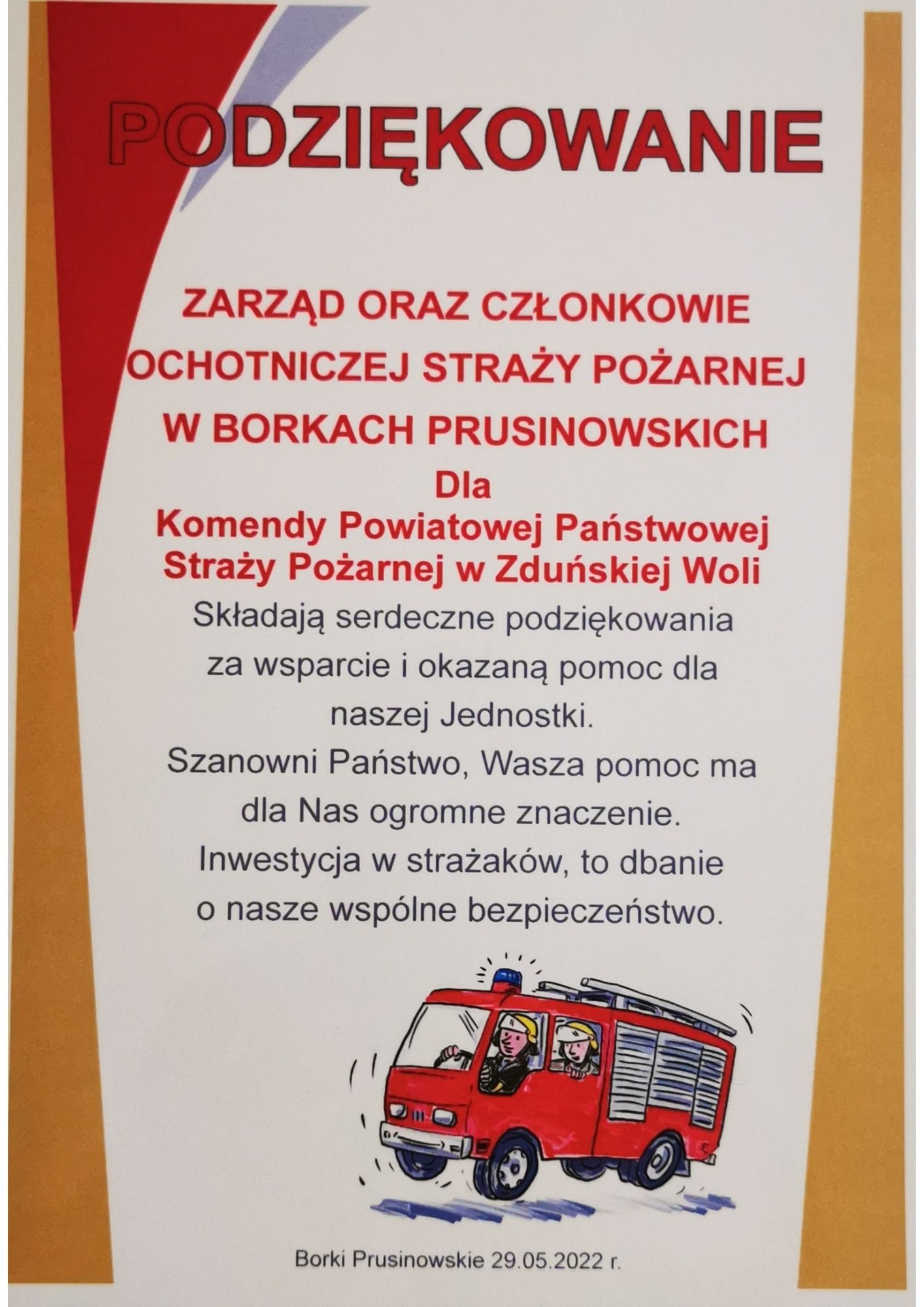 W dniu 29 maja 2022 roku o godzinie 14:00 obyła się uroczystość poświęcenia i przekazania remizy z zapleczem świetlicy w miejscowości Borki Prusinowskie. W uroczystości uczestniczył zastępca Komendanta Powiatowego Państwowej Straży Pożarnej w Zduńskiej Woli mł. bryg. Łukasz Drzewiecki.