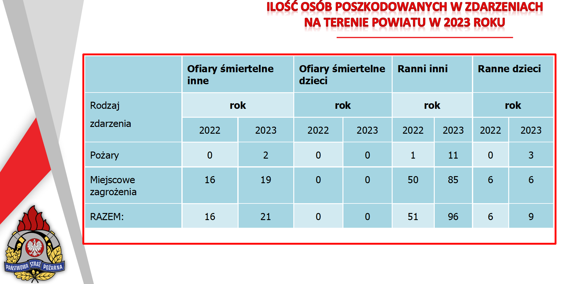 64% wyjazdów tj. 367 interwencji to miejscowe zagrożenia. W tych zdarzeniach śmierć poniosło 19 osób a 85 zostało rannych (w tym 6 dzieci).