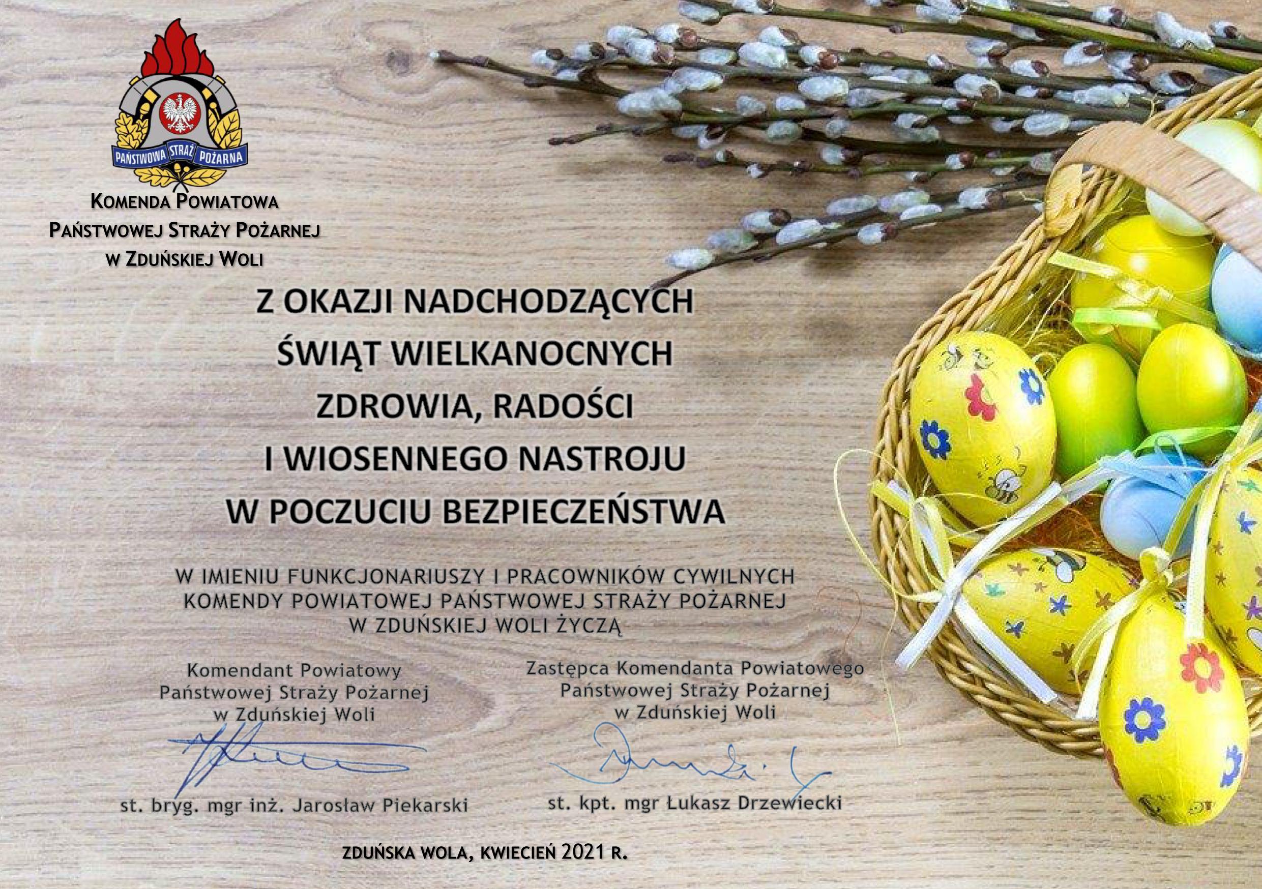 Z okazji nadchodzących Świąt Wielkanocnych funkcjonariusze i pracownicy cywilni Komendy Powiatowej Państwowej Straży Pożarnej w Zduńskiej Woli życzą wszystkim zdrowia, radości i wiosennego nastroju w poczuciu bezpieczeństwa.