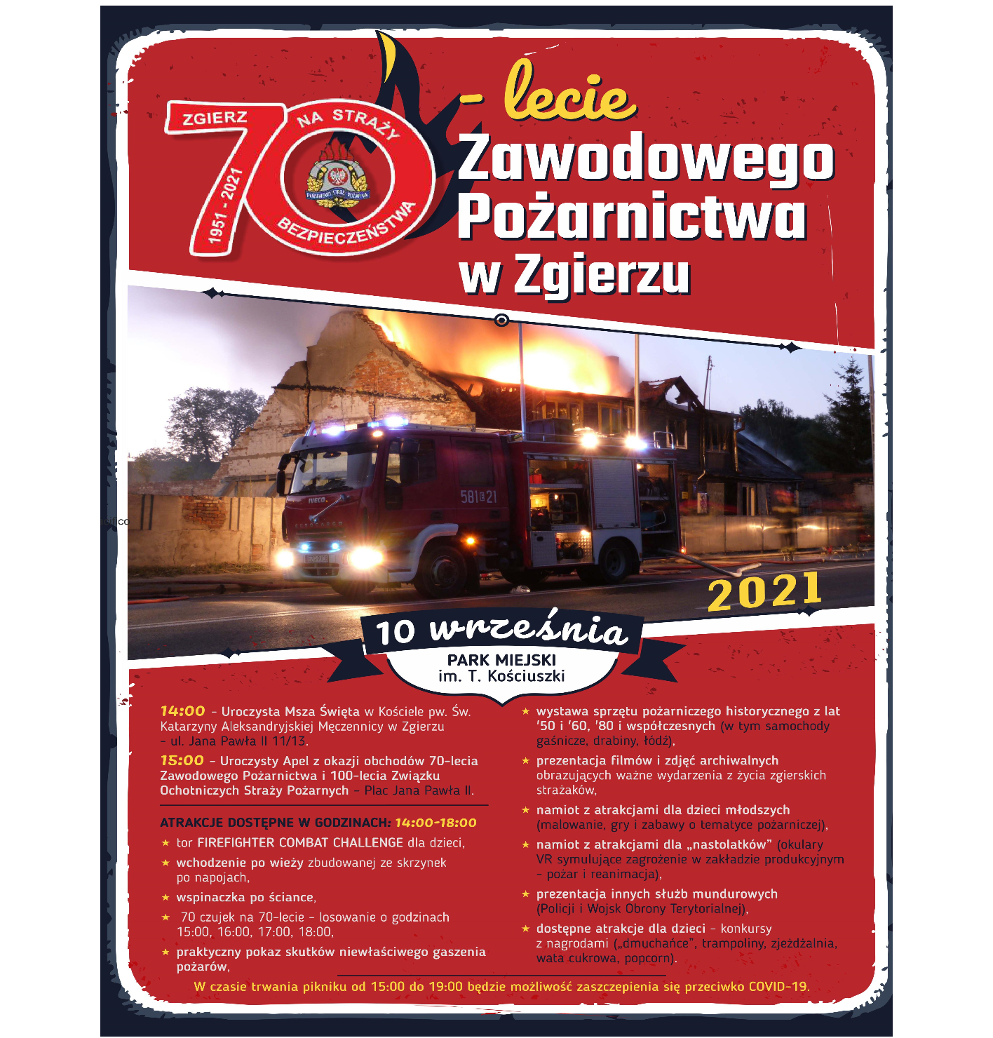 Szanowni Państwo w piątek 10.09.2021r. obchodzimy 70-lecie Zawodowego Pożarnictwa w Zgierzu połączone z obchodami 100 - lecia Związku Ochotniczych Straży Pożarnych Rzeczypospolitej Polskiej.