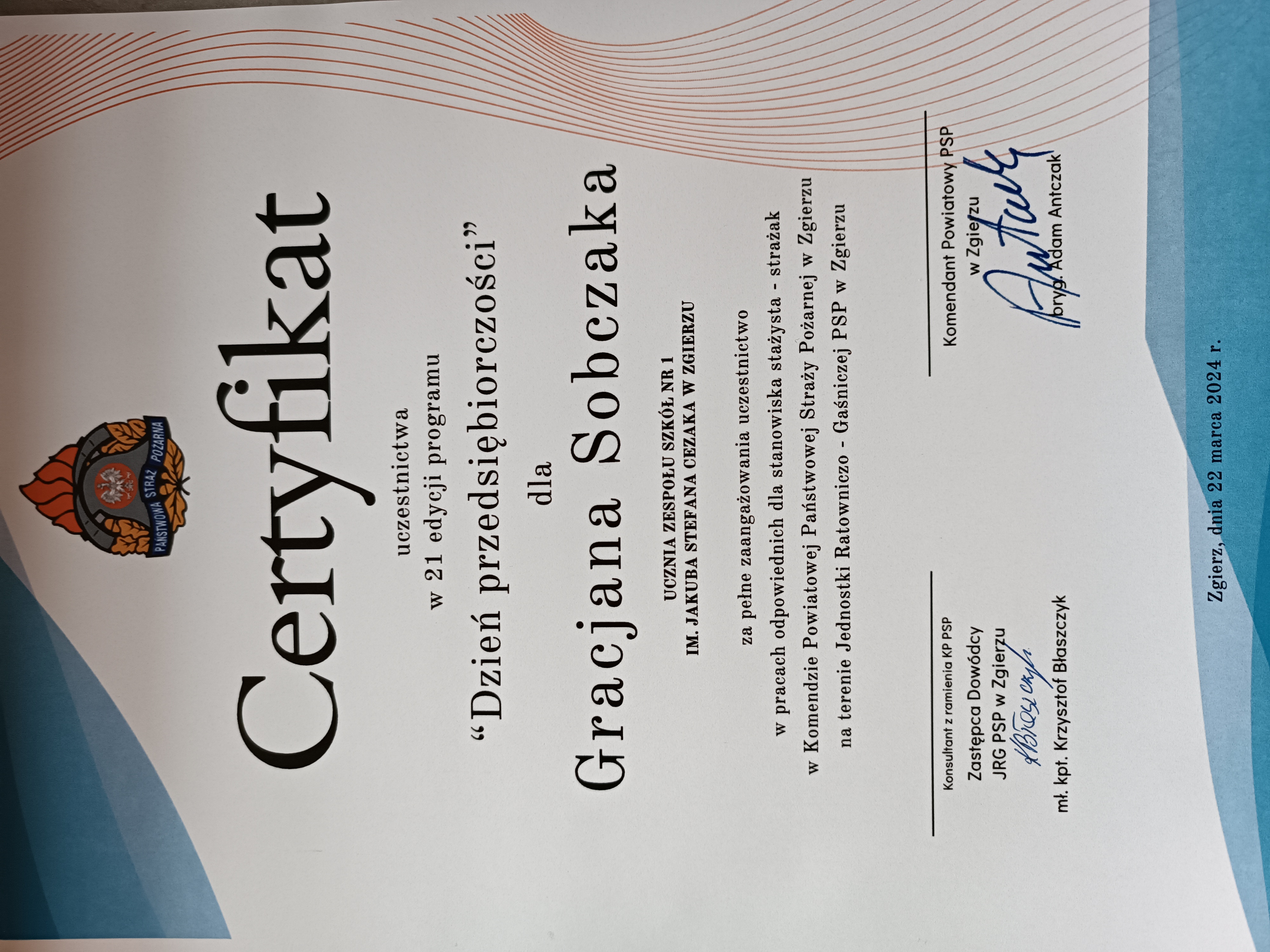 W dniu 22 marca 2024 r. Gracjan Sobczak – uczeń Zespołu Szkół nr 1 im. Jakuba Stefana Cezaka w Zgierzu, odwiedził Jednostkę Ratowniczo-Gaśniczą w Zgierzu w ramach 21 edycji programu „Dzień przedsiębiorczości”.