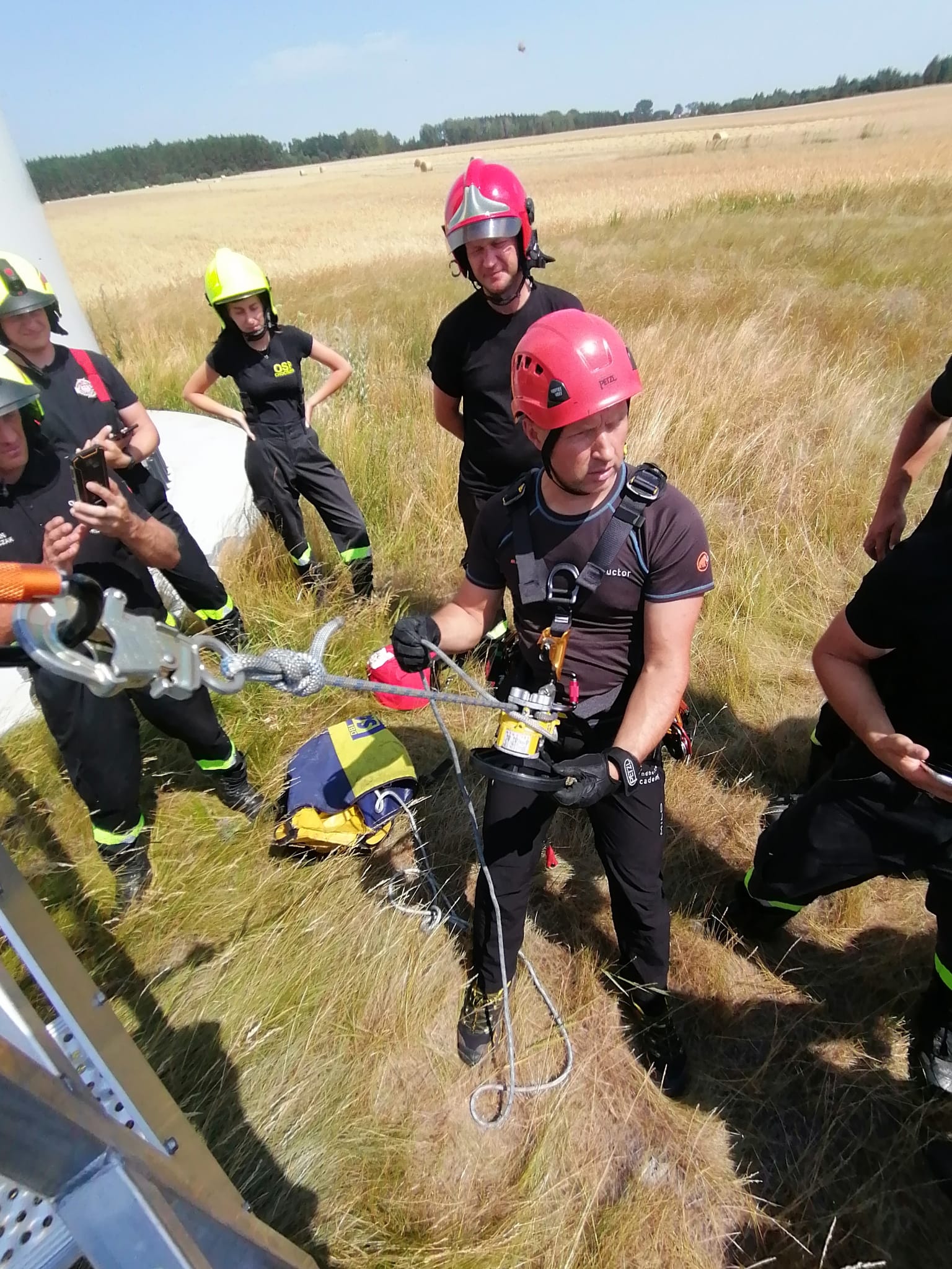 Ponadto przedstawiono możliwe do wykonania techniki ratownictwa wysokościowego przy użyciu sprzętu specjalistycznego będącego na wyposażeniu straży pożarnej. W szkoleniu uczestniczyli instruktorzy ratownictwa wysokościowego ze wszystkich zmian służbowych zgierskiej komendy, a także wytypowani druhowie osp z jednostek najbliższych farmie wiatrowej.