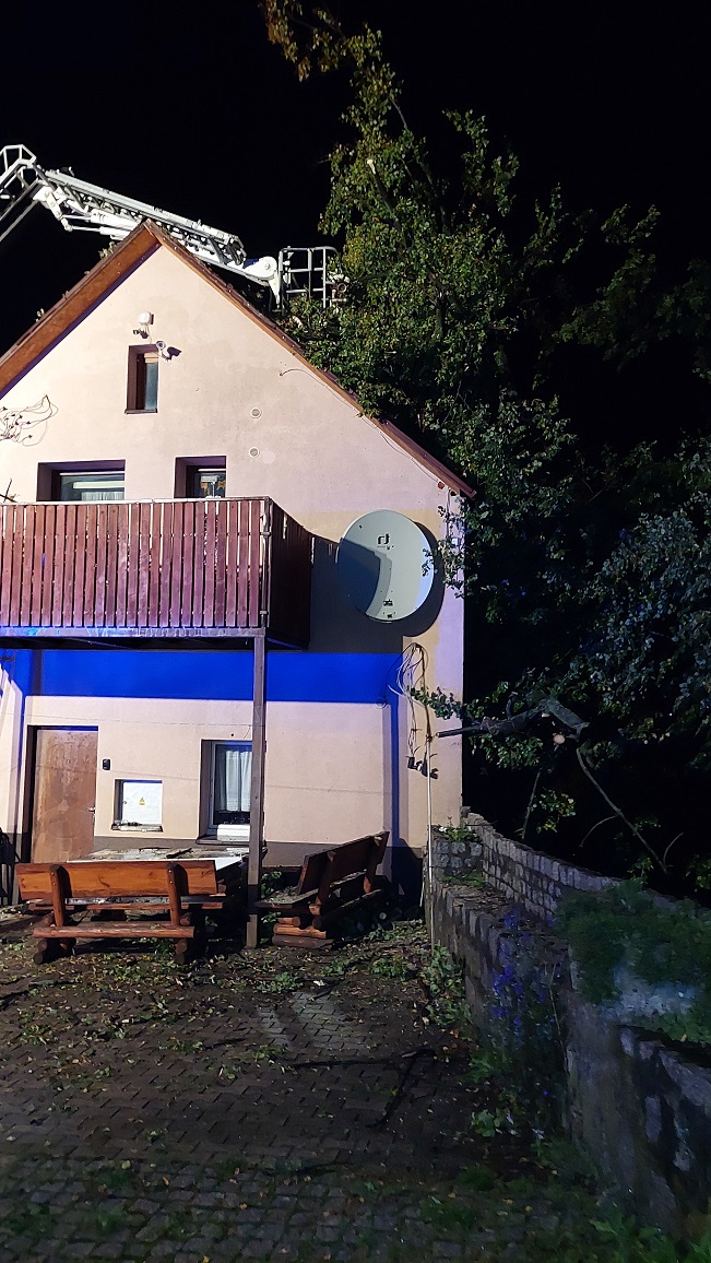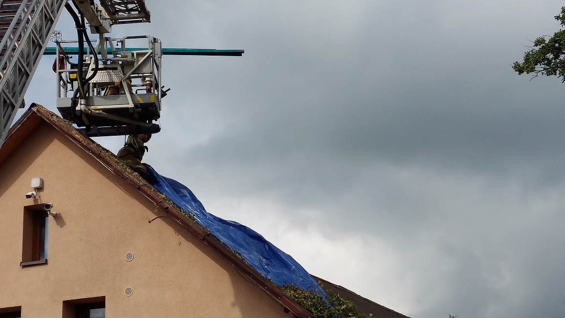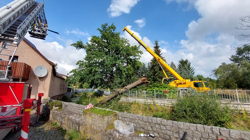 Do najniebezpieczniejszego zdarzenia doszło w Bogatyni przy ul. Turowskiej, gdzie w dniu 26.08.2022r. w godzinach nocnych doszło do przewrócenia się drzewa rosnącego po drugiej stronie rzeki Miedzianki, na dom mieszkalny. Usunięcie drzewa bez użycia dźwigu okazało się niemożliwe do wykonania. W nocy podjęto działania, w ramach których usunięto konary i gałęzie celem odciążenia konstrukcji dachu oraz przy pomocy plandek zabezpieczono uszkodzony dach przed zalaniem mieszkania. Kolejna działania podjęto w dniu 27.08 - strażacy zabezpieczyli miejsce zdarzenia a przy pomocy zadysponowanego przez Gminne Centrum Zarządzania Kryzysowego w Bogatynia dźwigu z KWB Turów, pień drzewa usunięto z budynku.