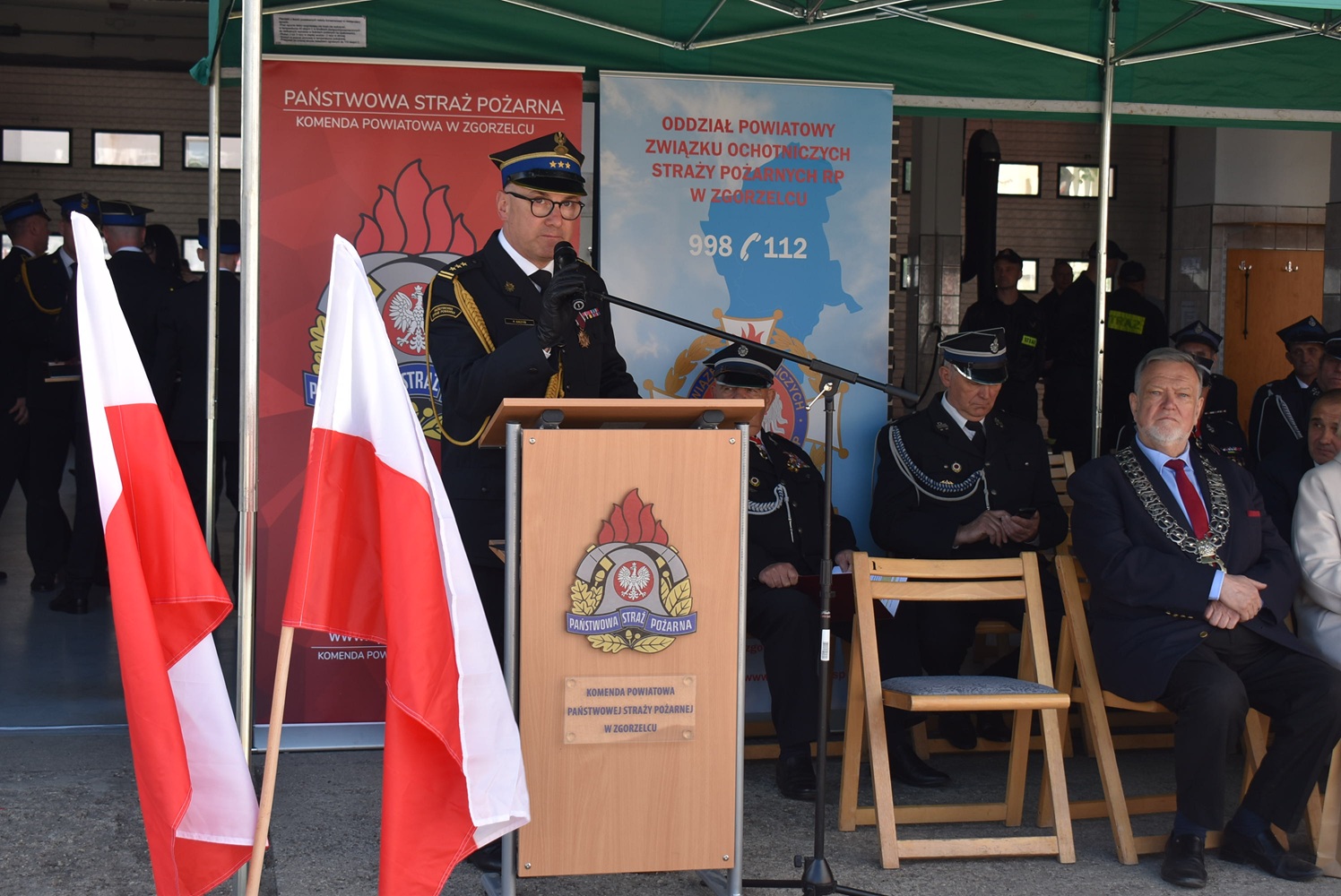 Następnie przy dźwiękach hymnu państwowego dokonano podniesienia flagi na maszt. Uroczystą akademię rozpoczął Komendant Powiatowy Państwowej Straży Pożarnej w Zgorzelcu, bryg Artur Czułajewski oraz Wiceprezes Zarządu Oddziału Powiatowego Związku OSP RP w Zgorzelcu, druh Kazimierz Słabicki.