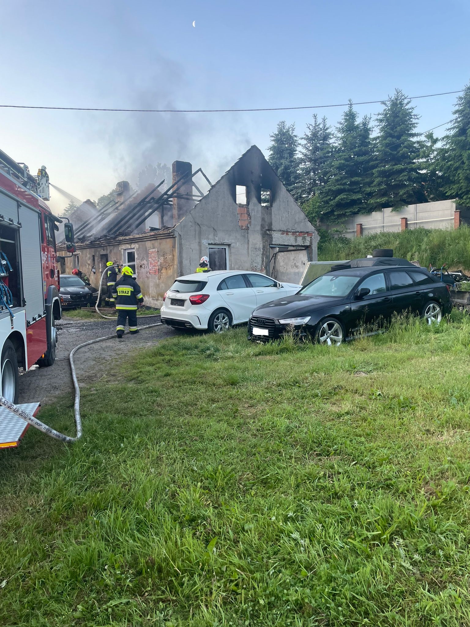Kierujący działaniami gaśniczymi w wyniku rozpoznania ustalił, że budynek gospodarczy w całości objęty był pożarem. Będący na miejscu właściciel poinformował że budynek objęty pożarem to warsztat samochodowy w którym znajdują się części samochodowe oraz naprawie samochody.