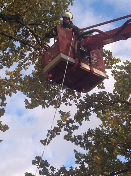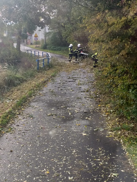 - Zgorzelec, ul. Boczna: drzewo (świerk) zostało wyrwane przez wiatr i przechyliło się na budynek mieszkalny, częściowo wspierając się na koparko ładowarce zaparkowanej pomiędzy drzewem a budynkiem mieszkalnym. Po przybyciu drabiny mechanicznej, ratownicy z kosza drabiny, przy użyciu pilarki do drewna pocięli drzewo na mniejsze elementy i usunęli zagrożenie.