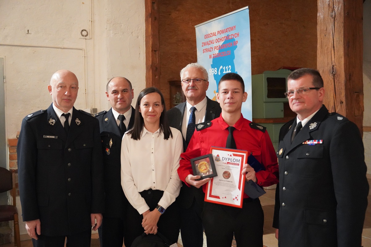 Spotkanie rozpoczęło się podniosłym akcentem wręczenia odznaczenia Komendanta Głównego PSP "Iuvenis Forti" młodemu druhowi z jednostki OSP Węgliniec, Adrianowi Pańkowowi, który swoją wzorową i godną naśladowania postawą, przyczynił się do uratowania życia i zdrowia ludzkiego. Odznakę wręczył Komendant Powiatowy PSP w Zgorzelcu, bryg. Artur Czułajewski wraz ze Starostą Zgorzeleckim, Panem Arturem Bielińskim, Prezesem Zarządu Oddziału Powiatowego ZOSP RP w Zgorzelcu, dh Waldemarem Błauciakiem oraz Burmistrzem Gminy i Miasta Węgliniec, Panem Mariuszem Wieczorkiem.