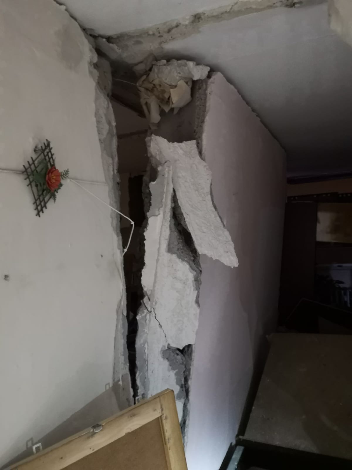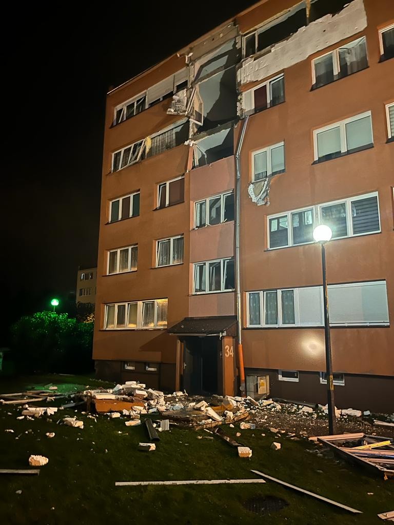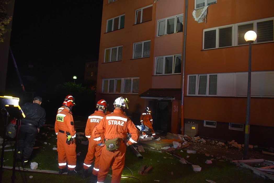 Po dojeździe pierwszych zastępów na miejsce zdarzenia Kierujący Działaniami Ratowniczymi stwierdził, że w budynku na klatce nr 34 na ostatniej kondygnacji doszło do zawalenia się ścian wewnętrznych a na zewnątrz budynku zostało wyrzuconych część ścian osłonowych. Brakujące elementy konstrukcyjne i elewacyjne budynku rozrzucone zostały w promieniu kilkudziesięciu metrów wokół budynku. Zespół ratownictwa medycznego udzielał pomocy przytomnemu poparzonemu mężczyźnie leżącemu na trawie, który o własnych siłach opuścił mieszkanie, w którym doszło do wybuchu.