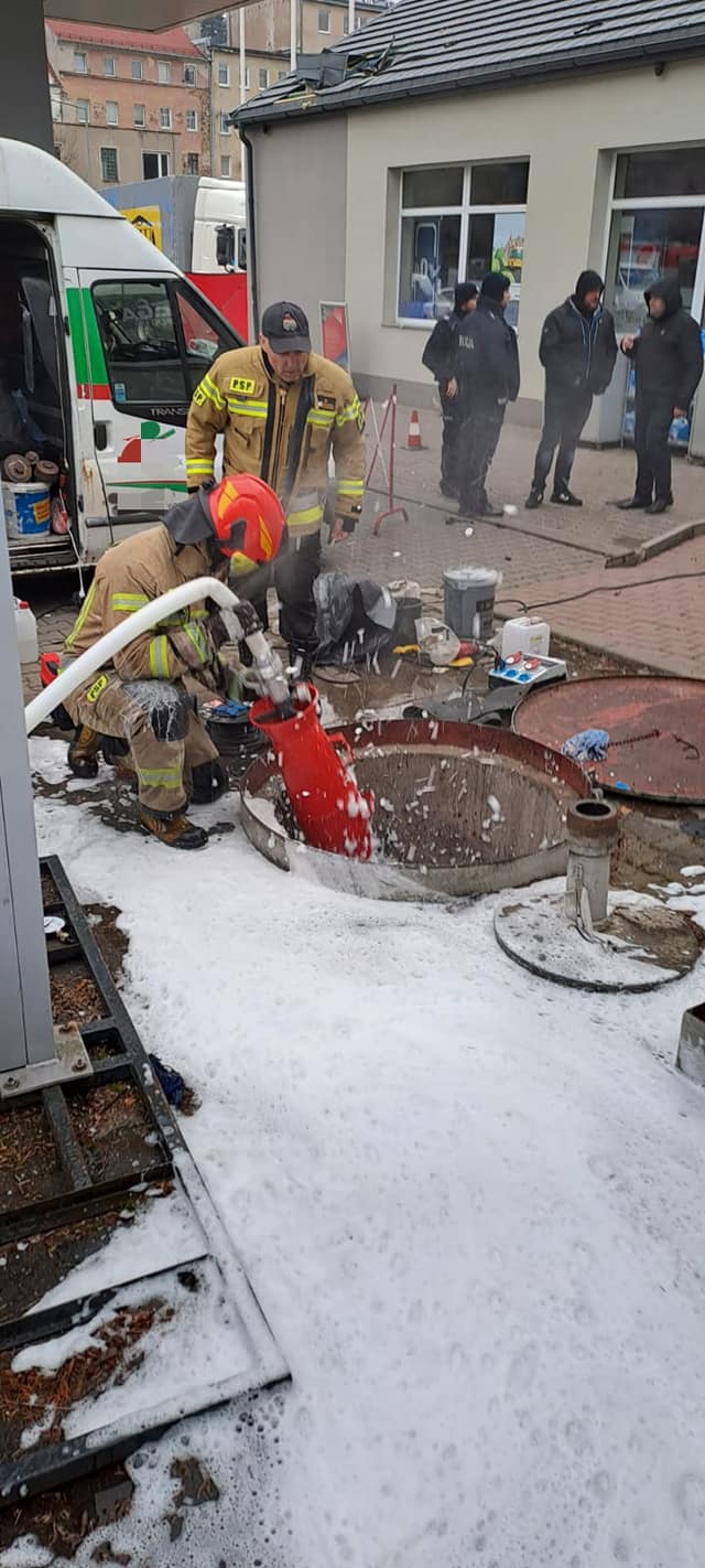Działania ratowniczo-gaśnicze polegały na udzieleniu kwalifikowanej pierwszej pomocy poszkodowanym osobom oraz wypełnieniu pianą średnią zbiornika podziemnego w celu wyeliminowania zagrożenia pożarowego.